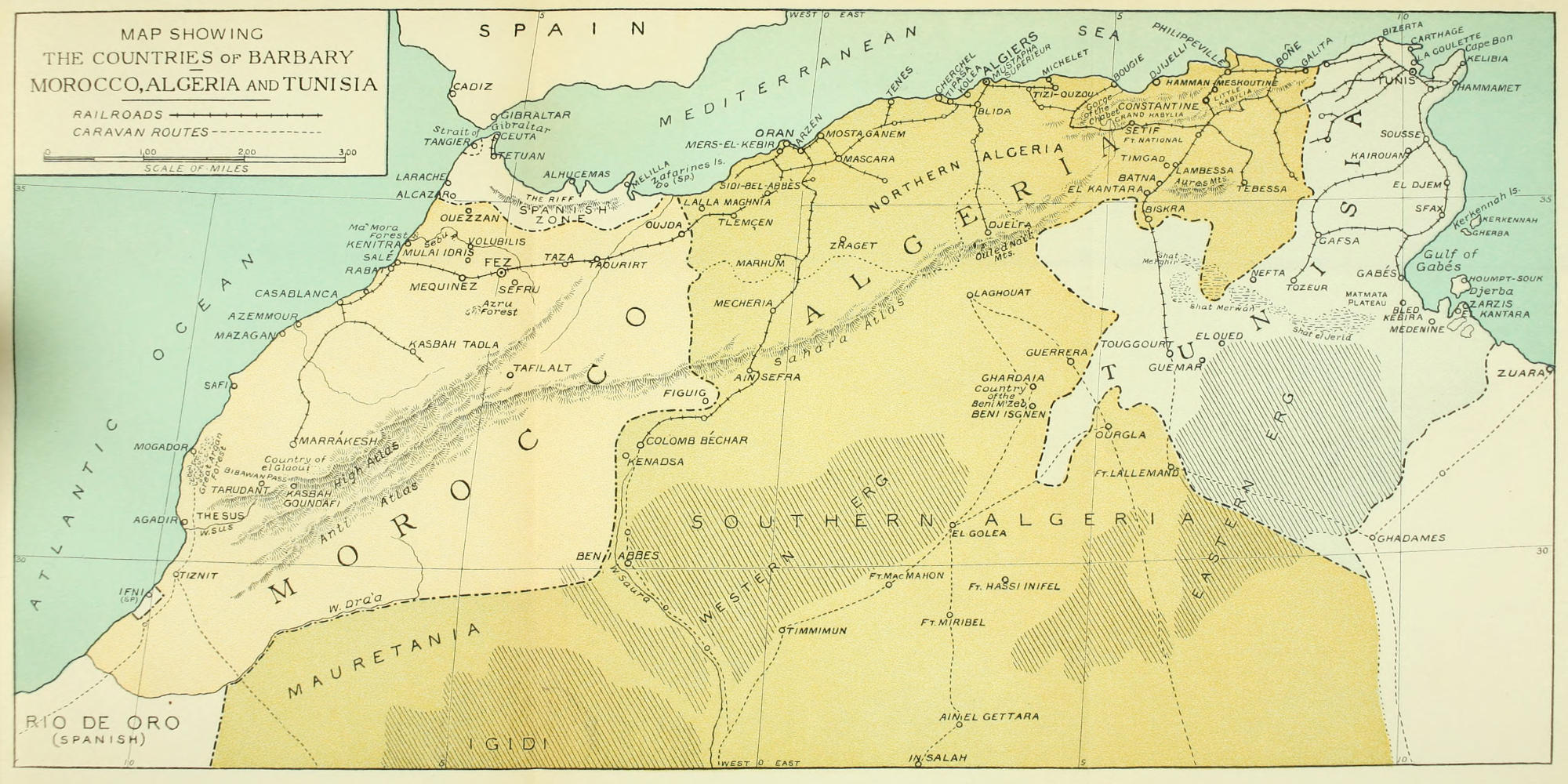 The truth of the matter is that most Americans, and most Europeans too for that matter, think of Barbary in terms of the corsairs, the Garden of Allah, the dancing-girls of the Ouled-Naïl, the Foreign Legion, Raisuli and Perdicaris, the squalor and confusion of Europeanized Tangier, the Riff and Abd-el-Krim, the luxurious resort hotels of Algiers, the Street of the Perfume-Sellers in Tunis, Moroccan leather-work, camels, tiled gateways, the utterly impossible sheikhs described by Mrs. Hull and interpreted by Hollywood, and the sand-dunes so frequently pictured in the “National Geographic Magazine.” With our unfortunate propensity for generalizing, we have assumed that these high spots were typical of Barbary, [viii]thus forming a mental picture which is as fantastic as it is inaccurate.