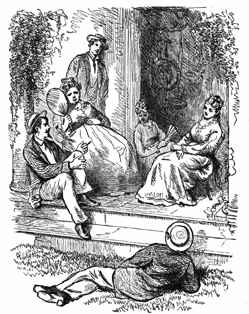Scene: a family party on a veranda at sunset. Aunt Markham lying back in a large chair, fanning as if her existence depends on keeping cool—as perhaps it does, poor woman! since she weighs at least fourteen stone; Sylvia reclining in a smaller chair, with her filmy dress falling around her to the floor, her pretty face flushed with heat, her gray eyes slightly languid; Eric on the steps with his back against a jasmine-twined pillar, and a cigar, which he does not light, between his fingers; Charley Kenyon stretched on the grass just below the steps; Rupert hovering to and fro; I established in the hall-door, for the sake of a through-draught—the month being July, and the thermometer standing at eighty-five.