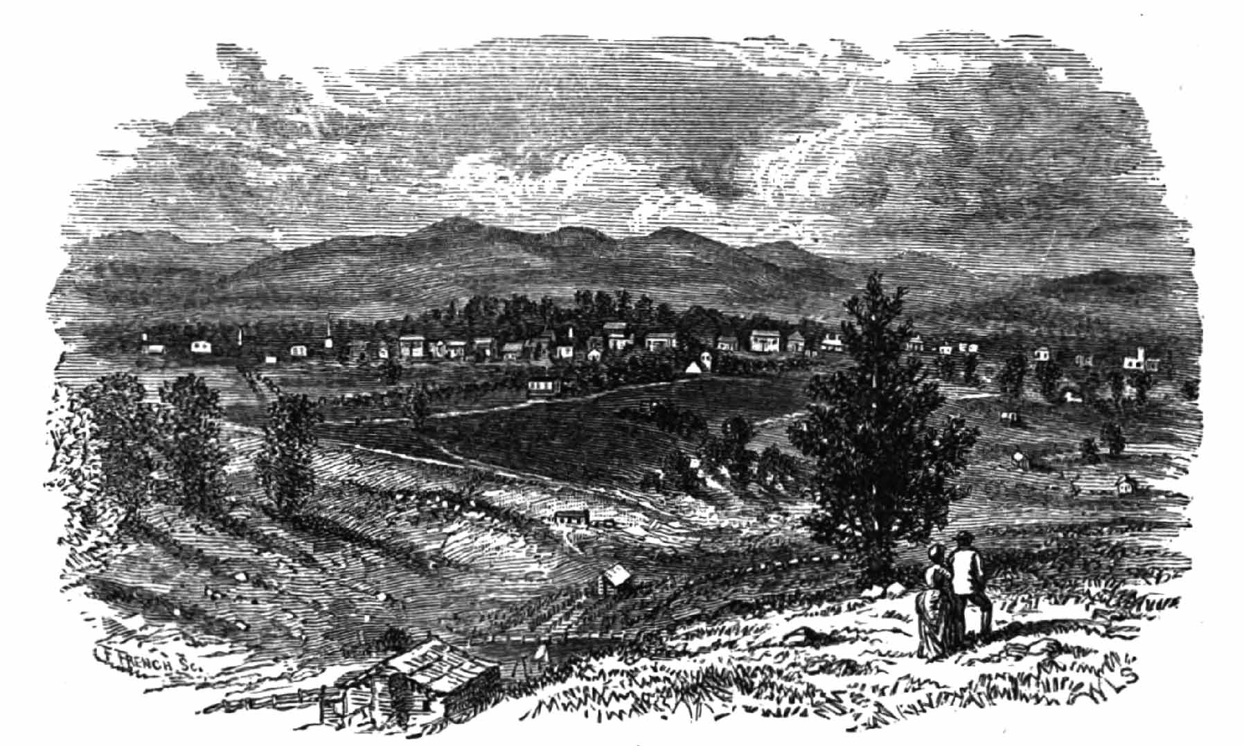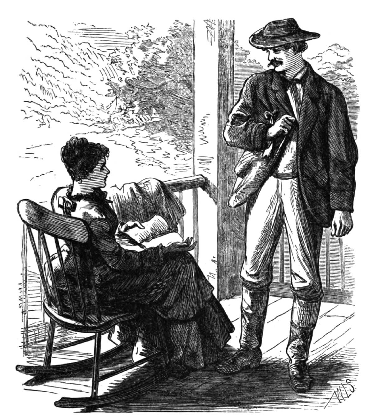 What is before us is a hotel perched on a hill. A few other houses are scattered widely and wildly around. Great wooded mountains rise in the background. The hotel-piazza seems crowded as we approach—Aunt Markham and Eric in front, Charley escorting Sylvia and myself. We are the last of the straggling procession of passengers, and receive the concentrated stares of all the languid ladies with yellow-backed novels in their hands and sundowns on their heads, all the open-eyed children, and lounging men.