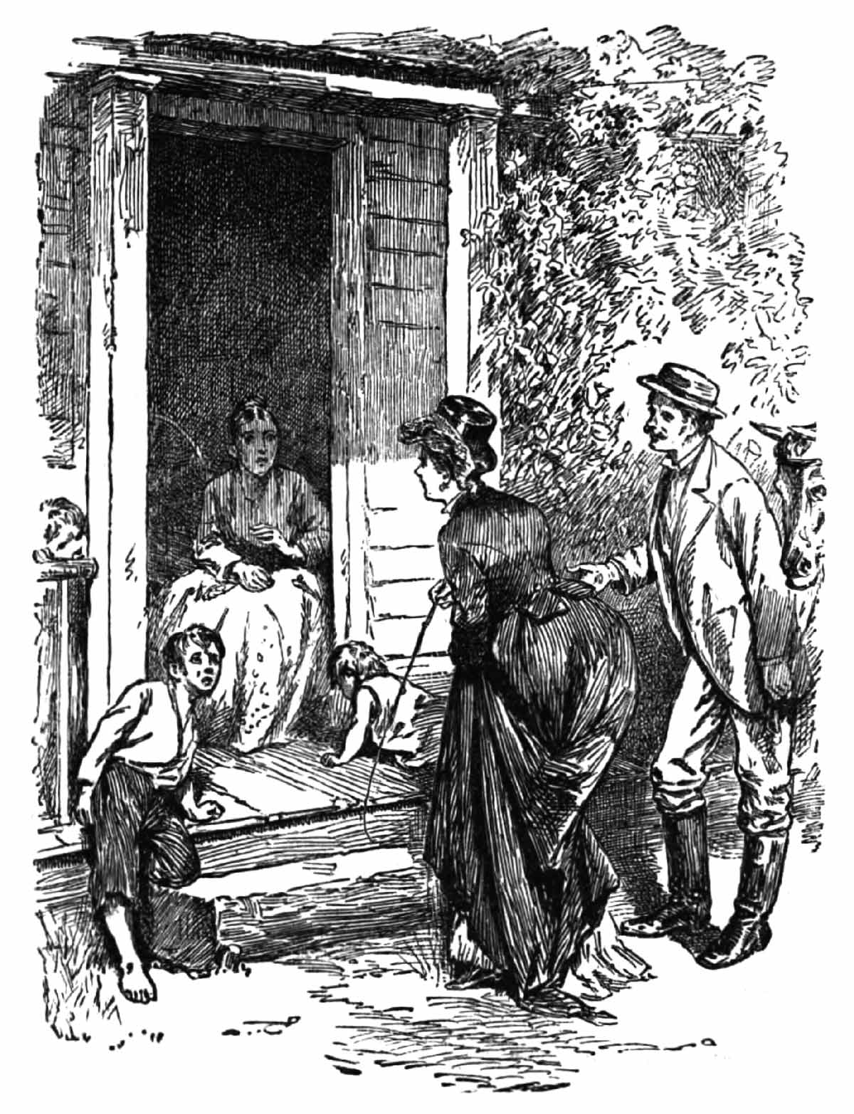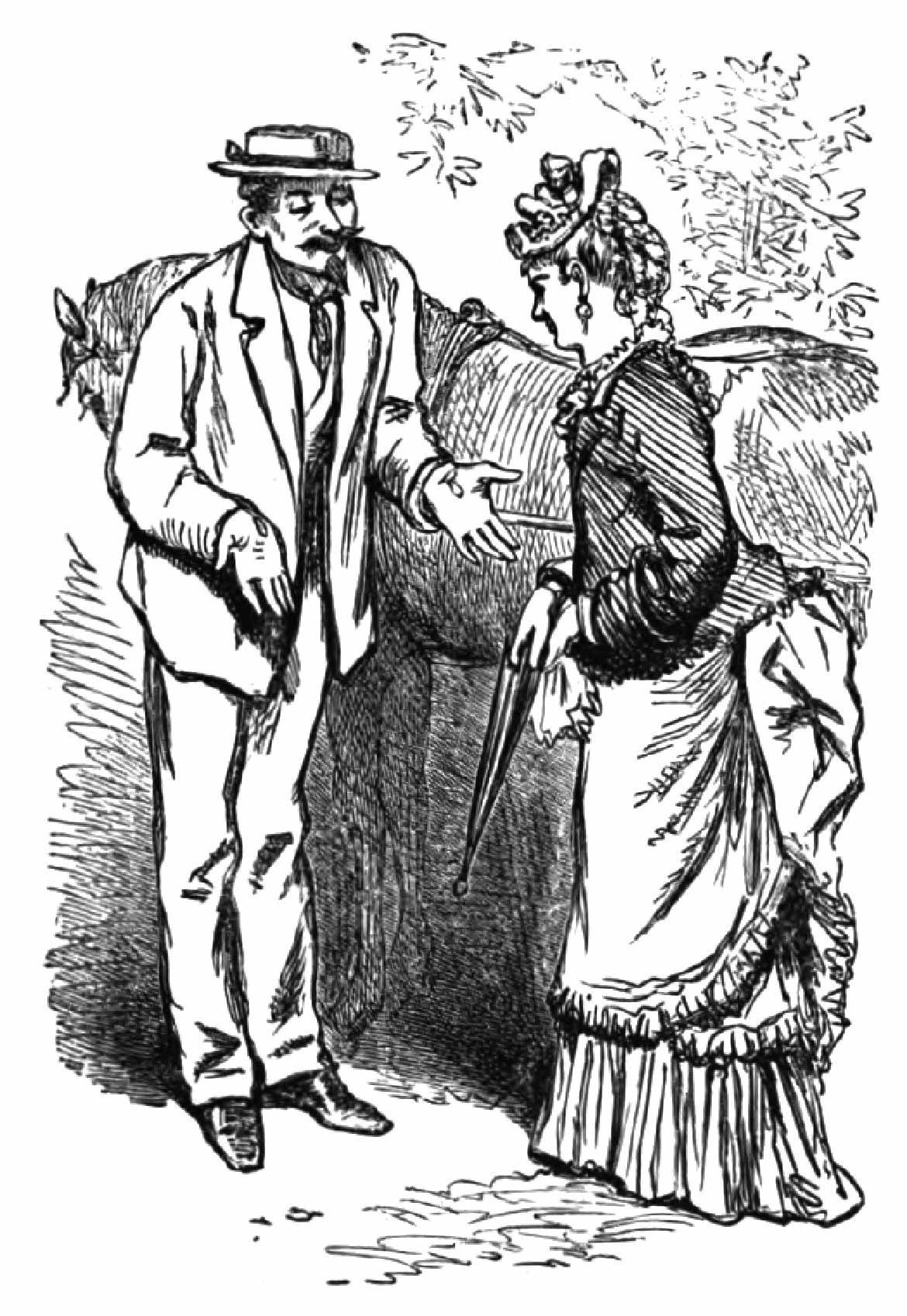 “Oh, he must not do that!” cries Sylvia, alarmed. “The hat is not worth any risk— in fact, I don’t care about it at all. Of course, it is utterly ruined. Charley!” (elevating her voice), “O Charley! please come away! Let the hat alone!”