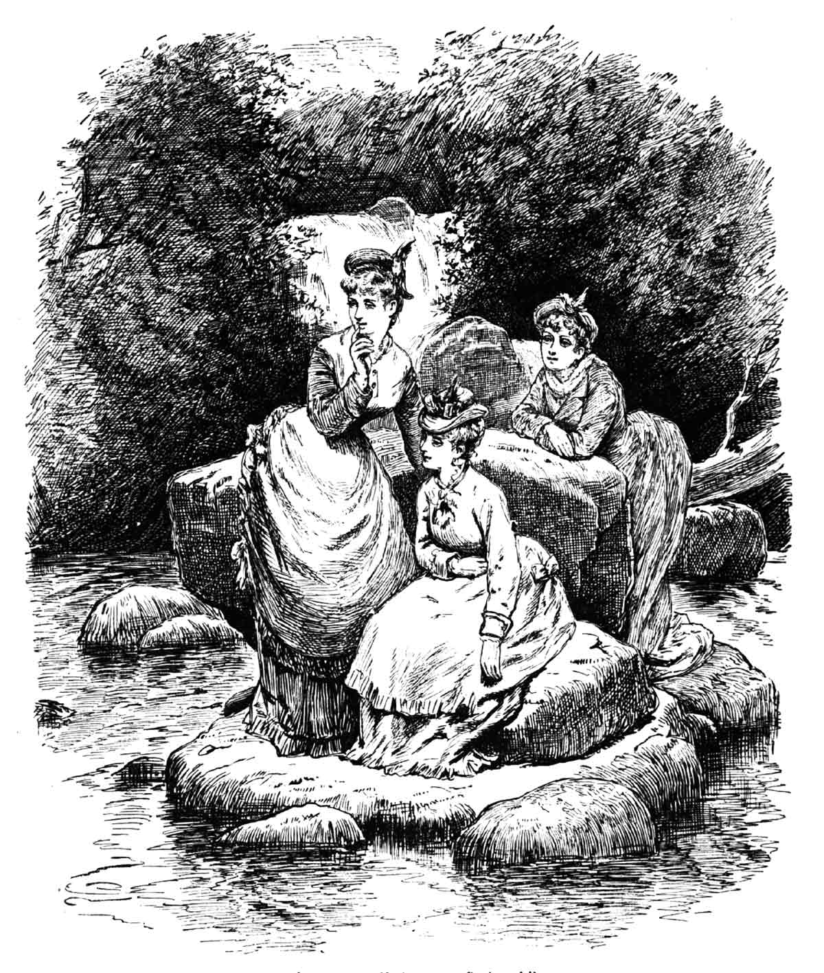 Sylvia is looking. Charley waves the hat triumphantly, then turns and makes his way up the bank, crosses the tree, and displays the dripping prize to its owner. Luckily, it is merely a felt hat, with no other trimming than a band of ribbon. Therefore, when dry, it will not be much the worse for its wetting, and its owner regards it with pride and complacency.