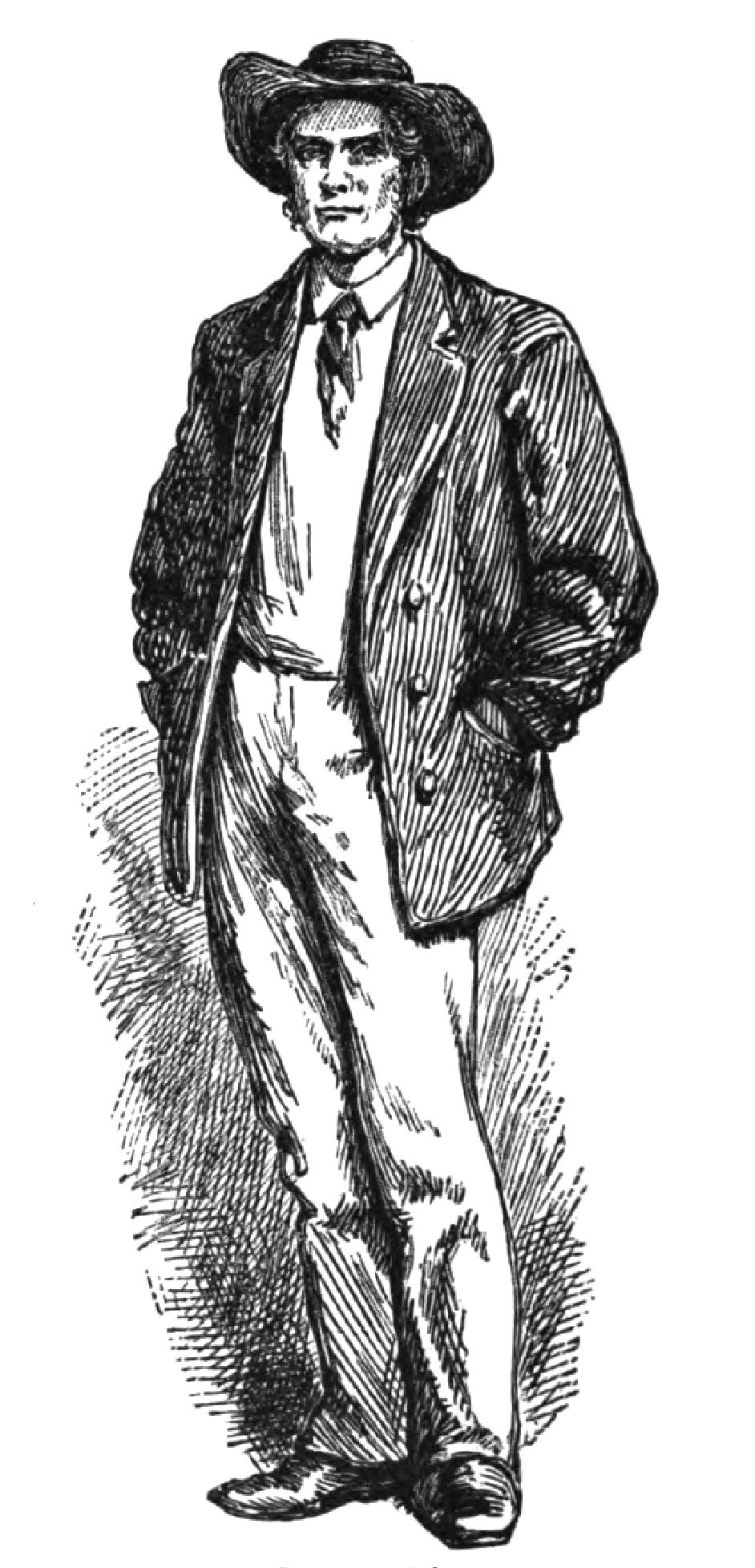 Of this famous character I have heard so much that I regard him with great interest. My knowledge of stage-drivers in real life being limited, I had drawn a fancy picture of a portly figure in top-boots and a “sprigged vest;” instead, I see a spare, sinewy man, dark as an Indian, with the eye of a hawk, who wears a pair of the brownest and dirtiest of corduroy trousers, a striped shirt, the sleeves of which are rolled up above the elbows showing thin, muscular arms, and a hat slouched rakishly over his brow. This is John Pence, who for twenty years has driven back and forth over Swannanoa Gap, and whom his admirers declare to be the best driver on the continent. If success is the test of merit, merit certainly must be his; for during these twenty years no accident has ever happened to a coach driven by him; and those expert in such matters say that one hardly realizes the art of driving until one has seen him handle the ribbons.