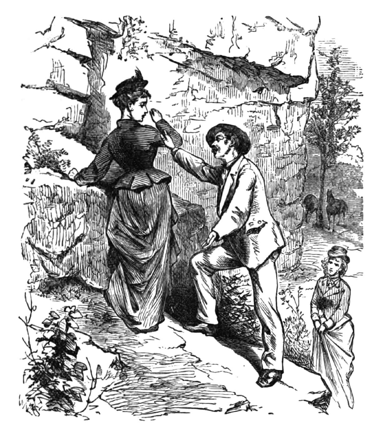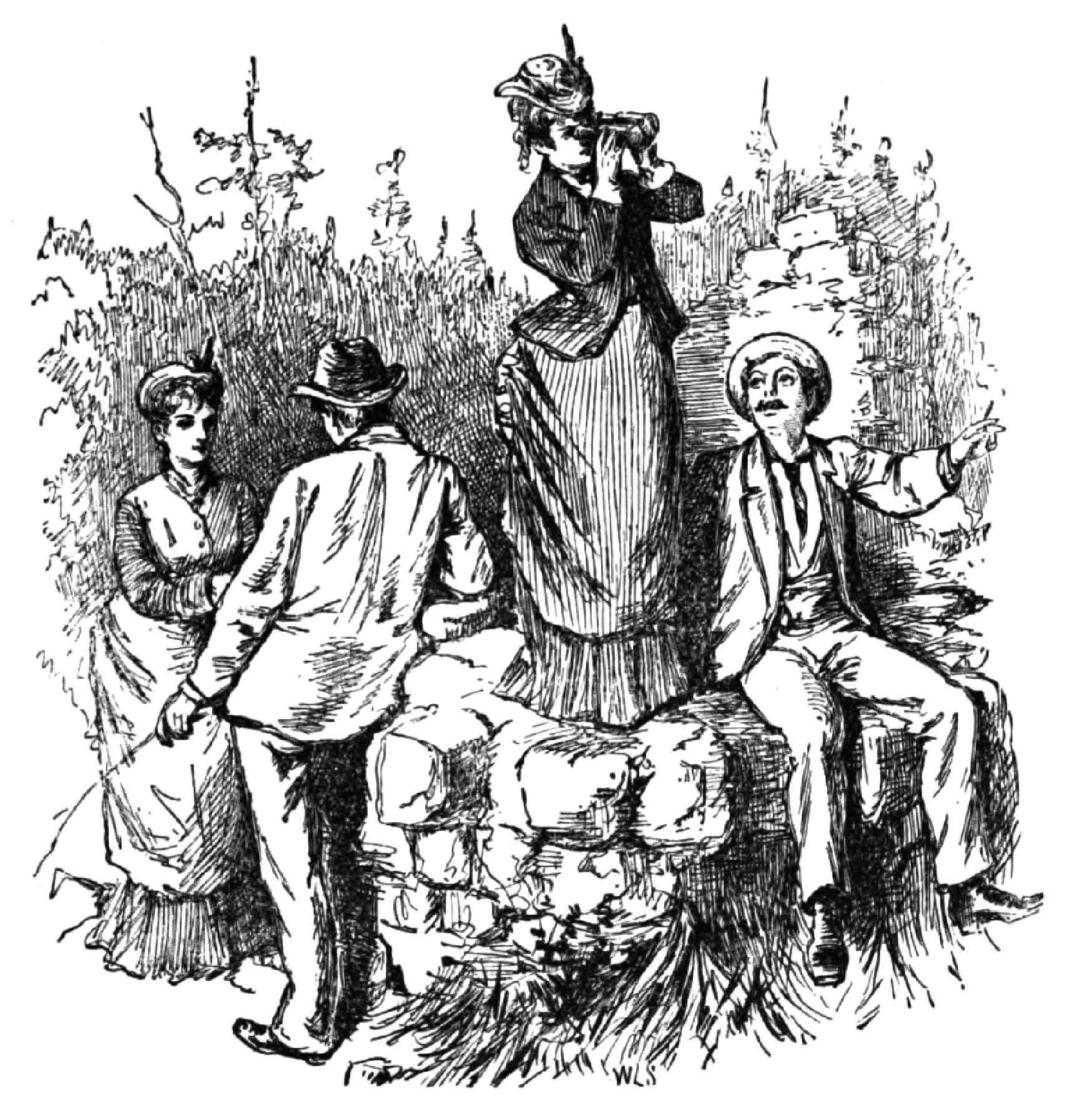 Mem.: These two are on the rocks by the fallen tree alone; the others have gone down to the pools, and only I—who lingered on the hillside to gather some ferns— overhear this conversation.