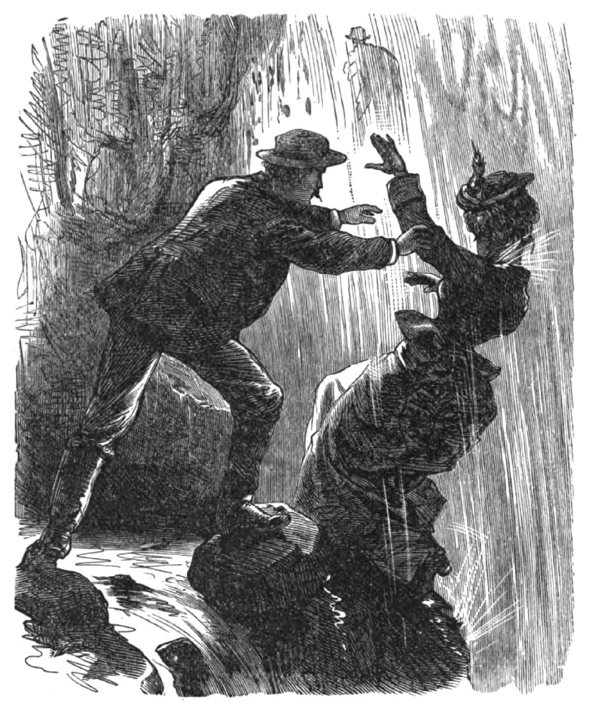 She advances out on the trunk as she speaks. It is certainly wide enough to afford good footing, but the farther end does not rest very firmly against the opposite bank, and the consequence is that it shakes as she walks. This, added to the fact of her elevation (six feet, at least) above the stream, with a sweeping fall on each side, and swift-rushing water underneath, makes her, as she afterward confesses, suddenly and unaccountably giddy. She stops, and Charley, seeing her change of color, springs into the water above which she has paused, and seizes the only thing within his reach—one of her feet!