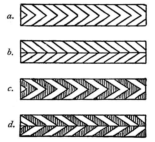 [451] Plaits of an uneven number of cords are seldom used, because they produce lopsided patterns.