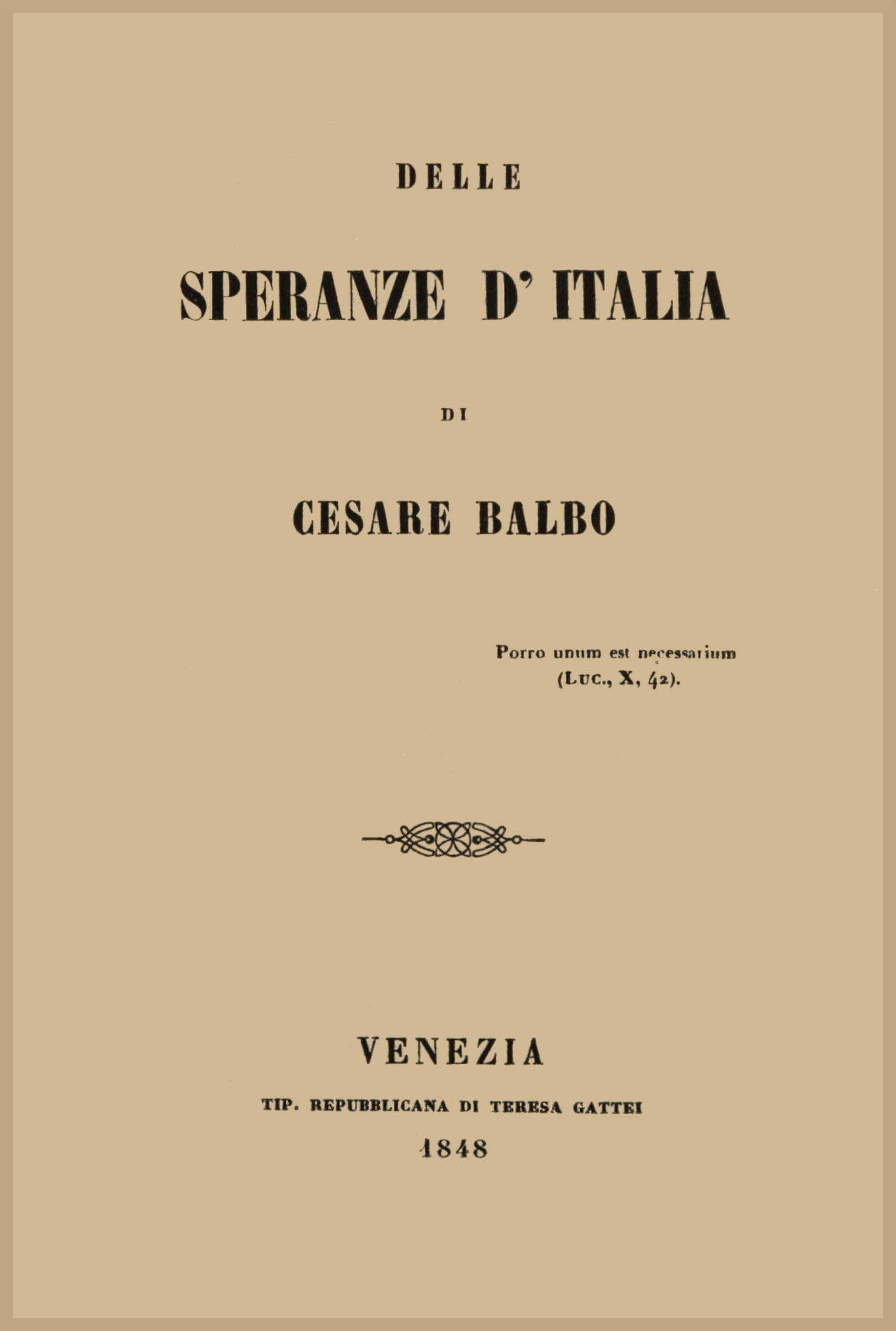I. Perchè ciò non entrava nell’assunto, nel cerchio, nel titolo del libro mio, che è delle Speranze, e non dei timori o dei malanni d’Italia; che non è storia o raccolta di fatti presenti, ma congetture di fatti avvenire.