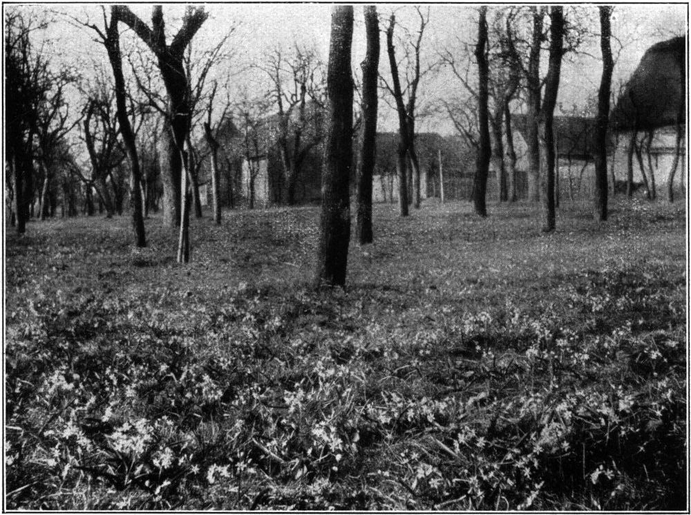 Bei der reichen Artenzahl der Waldbäume von verschiedener Wuchskraft und Wuchshöhe, bei wechselnder Verästelung und vielgestaltigem Blattbau, ist die einfallende Lichtmenge immerhin groß genug, um auch einen artenreichen Unterholzbestand aufkommen zu lassen. Gerade das Unterholz, welches eine reiche Vogelwelt beherbergt und dem lieblichsten Sänger, der Nachtigall, ihre leichtsinnig ausgewählten niederen Brutplätze bietet, ist ein besonderer [286]Wesenszug des Leipziger Auenwaldes. Auch hierbei herrscht eine reichhaltige Mannigfaltigkeit der Arten. Dr. Reiche sagt in einer netten, in den Dresdner Isis-Berichten 1886 veröffentlichten Skizze, daß das Unterholz in gleicher Zusammensetzung sich innerhalb Sachsens nur zweimal, um Leipzig und Meißen, entwickelt findet. Es besteht aus Ulmen, Feldahorn, Hasel, Weißdorn, Faulbaum, Traubenkirsche, schwarzem Holunder, Pfaffenhütchen und – als besondere Erscheinungen – aus Liguster und Hartriegel. Die meisten derselben schmücken sich im Spätsommer und Herbst mit saftig-fleischigen Früchten, die eben der Vogelwelt diese grünen Laubhallen zum beliebten Aufenthalt machen. Die gefiederte Welt besorgt gewiß auch die weitere Ansaat dieser Pflanzen, und wir sollten bei unseren Formationsbetrachtungen dem zoogenen Einfluß weit mehr Aufmerksamkeit schenken. Wasserläufe, welche als Kanäle oder Flußverzweigungen den Auenwald reichlich durchziehen, schmücken ihre Ufer weithin mit Strauchweiden (vgl. Abb. 8). Infolge der späteren Belaubung von Eiche und Esche wirkt die Frühlingssonne lebenweckend auf den sonst feuchtkühlen Auwaldboden und zaubert eine Fülle frühblühender Kräuter hervor, deren meist breite und tiefgrüne Blätter als erster Lenzesschmuck dem winterfahlen Waldboden entsprießen. Erst heben sich [290]nach Reiches Schilderung die grünen Spitzen der Laubblätter des massenhaft vorhandenen Märzbechers empor, ihnen folgt das kräftige Blattwerk des Aronstabs (Abb. 21) und das zarte Grün des Bärenlauches (Abb. 22), der alsbald seine weißen Sterndolden entfaltet, aber leider auch seinen Knoblauchduft, welcher unser Entzücken über die Waldespracht etwas herabstimmt. Zur Osterzeit läuten die Großglocken des Märzbechers, es leuchten die trübpurpurnen oder weißen Trauben des Lerchensporns, die rotknospigen Blaublüten des Lungenkrautes, die goldgelben Blütenbüschel des Goldsterns, die Blumensonnen der Feigwurz. Dazu erfreuen weiße und gelbe Anemonen und Blütendolden der Himmelschlüssel unser Auge, und ein zarter Duft wird von dem niedlichen Moschusblümchen in die Lenzluft gehaucht. In den pflanzenreichen Auwäldern der Eger südlich Theresienstadt mit ihren Millionen von Märzbechern (Abb. 23) gesellt sich zu den genannten Pflanzen noch der Blaustern der Scilla und das zarte Gedenkemein (Omphalodes), die beide auch in Sachsens Elbegebiet als Reste früheren Auwaldes, wenn auch als Seltenheiten, erhalten geblieben sind (Abb. 24). Eine ähnliche entzückende Auenwaldflora aus Frühlingsblühern gewebt, schmückt in Sachsen auch den Jahnalauf bis Riesa und streckenweise auch die Ufergehölze der Döllnitz, so daß wohl als sicher gelten darf, daß [291]auch die jetzigen Wermsdorfer Forsten früher ein Auenwaldgebiet darstellten, welches sich über Wurzen bis nach Leipzig hinzog. Auch an der Röder war sicherlich ein Auenwald entwickelt, und der Schloßgarten zu Wachau bei Radeberg (Abb. 25) bietet uns noch einen Restbestand. Überhaupt hat sich Auwaldgelände zu Parkanlagen englischen Stiles besonders geeignet und ist vielfach entsprechend benutzt worden.
