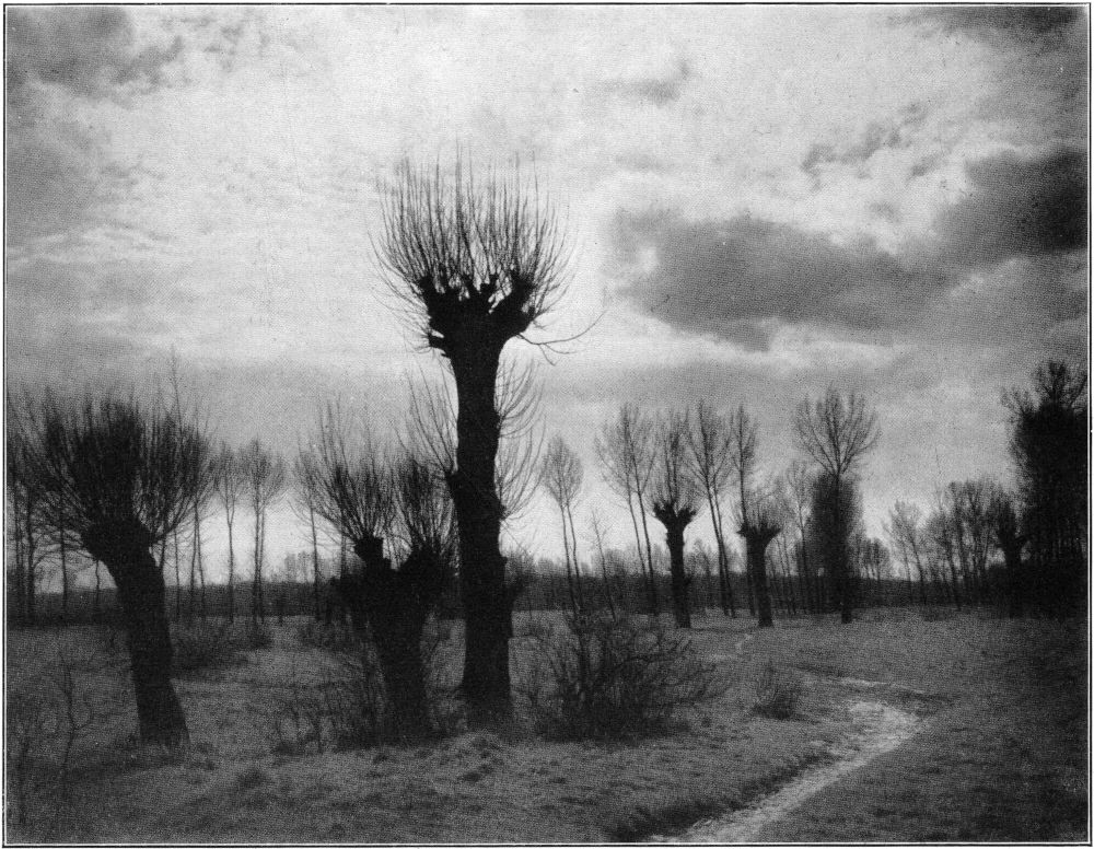 In der norddeutschen Niederung erlangen naturgemäß die periodischen Überschwemmungsgebiete ihre weiteste Ausdehnung und erzeugen, wie Drude sagt, scharfe Gegensätze zwischen Heide- und Auenwald. Hier werden auch die Flußauen, soweit der Eisgang das Aufkommen von Baumbeständen hindert, von sumpfigen Grasfluren und Grünmooren begleitet, wie uns die Abbildung 12 eines Flußtales in Posen durch den reichen Bestand an Wollgras mit seinen weißleuchtenden Fruchtfahnen dartut. Am Horizont erkennt man den dunkelgrünen Wall des Auenwaldes, soweit nicht dauernd nasses Gelände einen Bruchwald schafft, einen Sumpfwald aus Erlen und stattlichen Weiden, durchsetzt mit Birken und Schwarzpappeln[2].