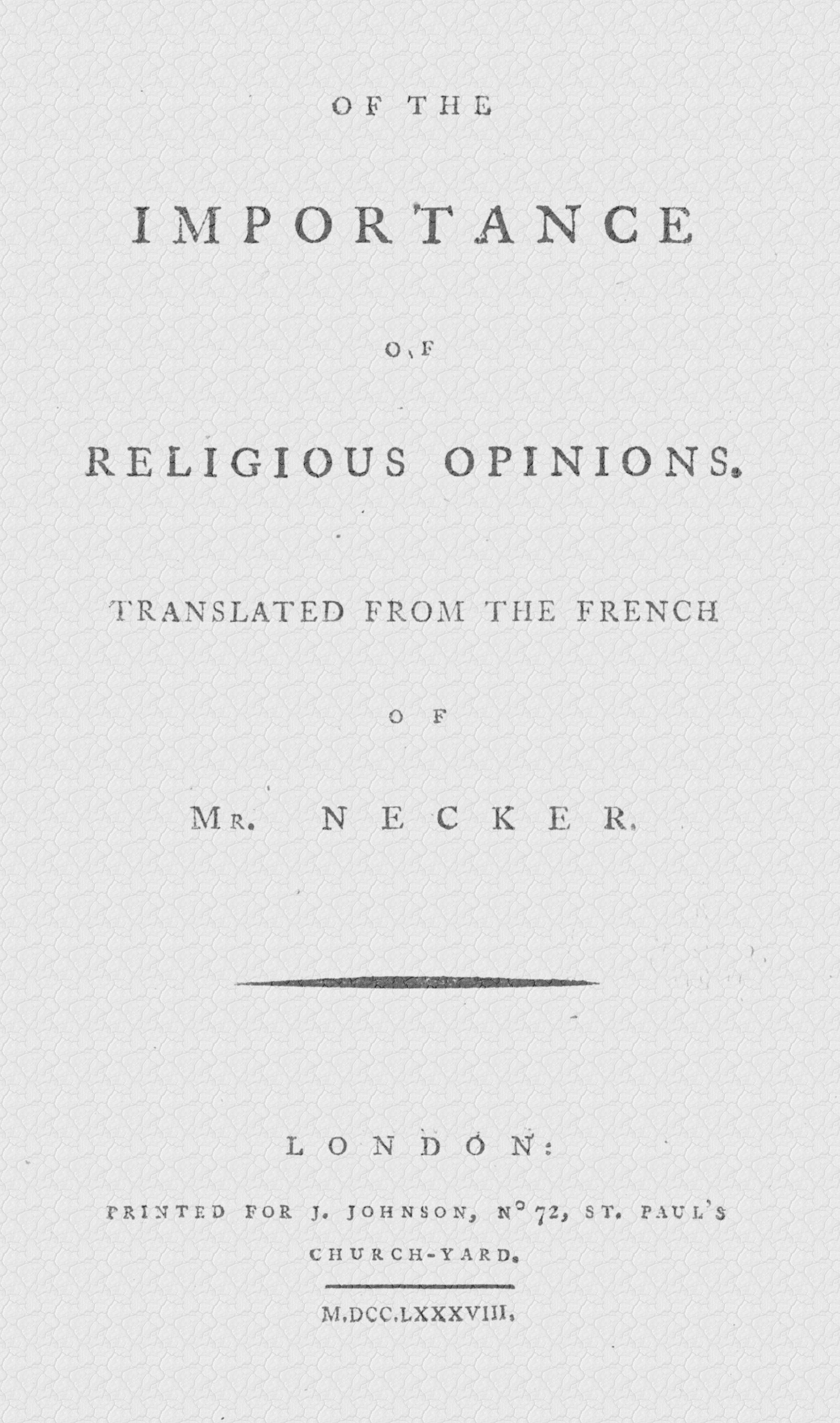 iiiOne could not have taken an active part in the administration of public affairs; or made it the object of stedfast attention; one could not have compared the several relations of this great whole, with the natural dispositions of minds and characters; nor indeed observed men in a perpetual state of rivalry and competition, without perceiving, how much the wisest governments need support from the influence of that invisible spring which acts in secret on the consciences of individuals. Thus whilst I am endeavouring to form some reflections on the importance of religious opinions, I am not so far removed from my former habit of thinking as may, at the first glance, be imagined; and as in writing on the management of finances, I omitted no argument to prove that there is an intimate connexion between the efficacy of governments, and the wisdom with which they are conducted; between the virtue of princes, and the confidence of their subjects, I think I am still proceeding in the same train of sentiment and reflection, when struck with ivthat spirit of indifference which is so general, I endeavour to refer the duties of men to those principles which afford them the most natural support.