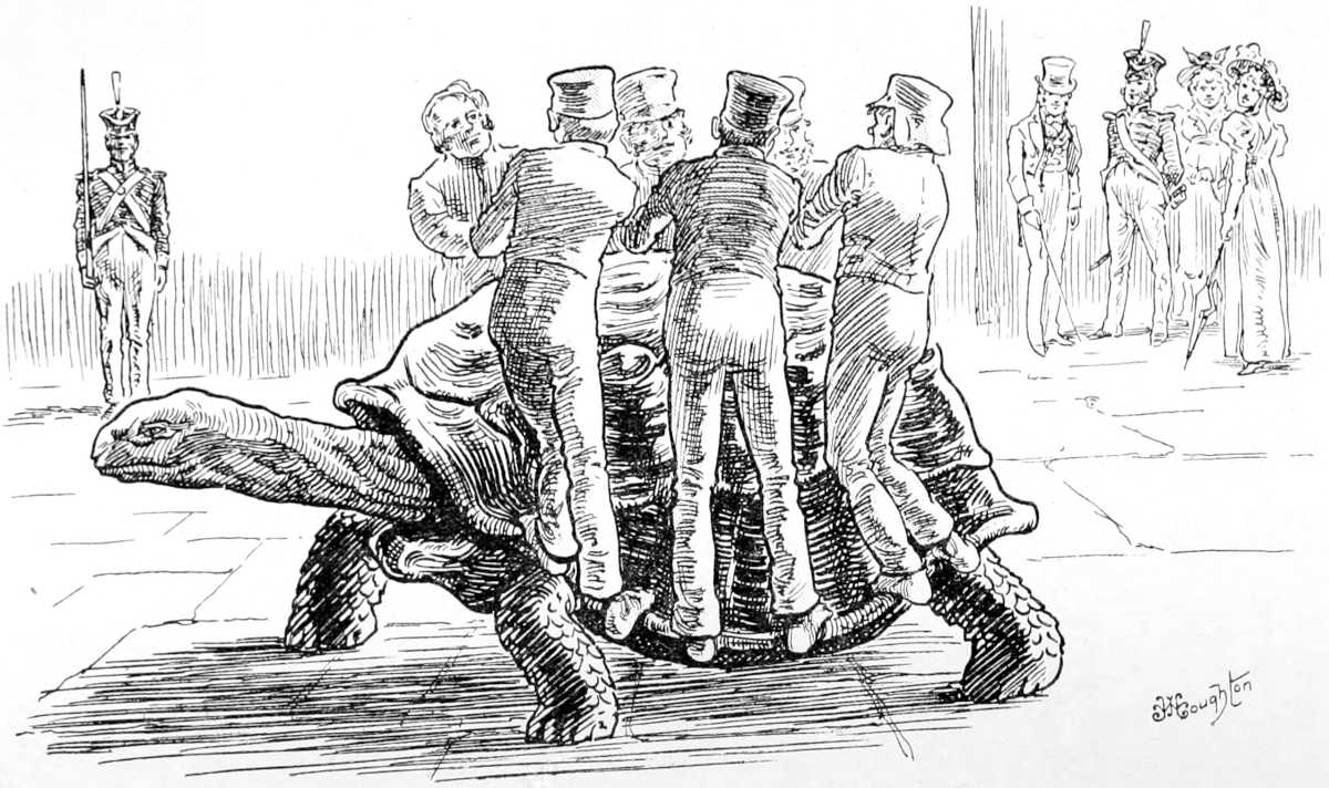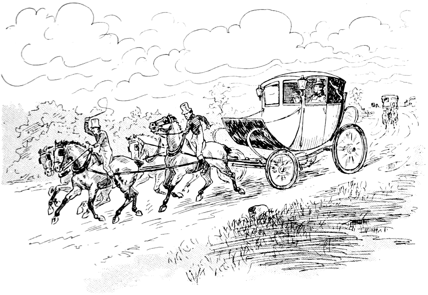 The road inside the compound was flat and winding, lit on either side by cocoanut-oil lamps, mounted on poles just level with my eyes, which prevented my seeing obstacles in the way. The syce was seated on the step as usual. All at once I found myself on my head, with the buggy on top of me. Horse and shafts had disappeared. Being not far from the house, I joined the Admiral as he left his carriage. I was supposed to be part of his staff.