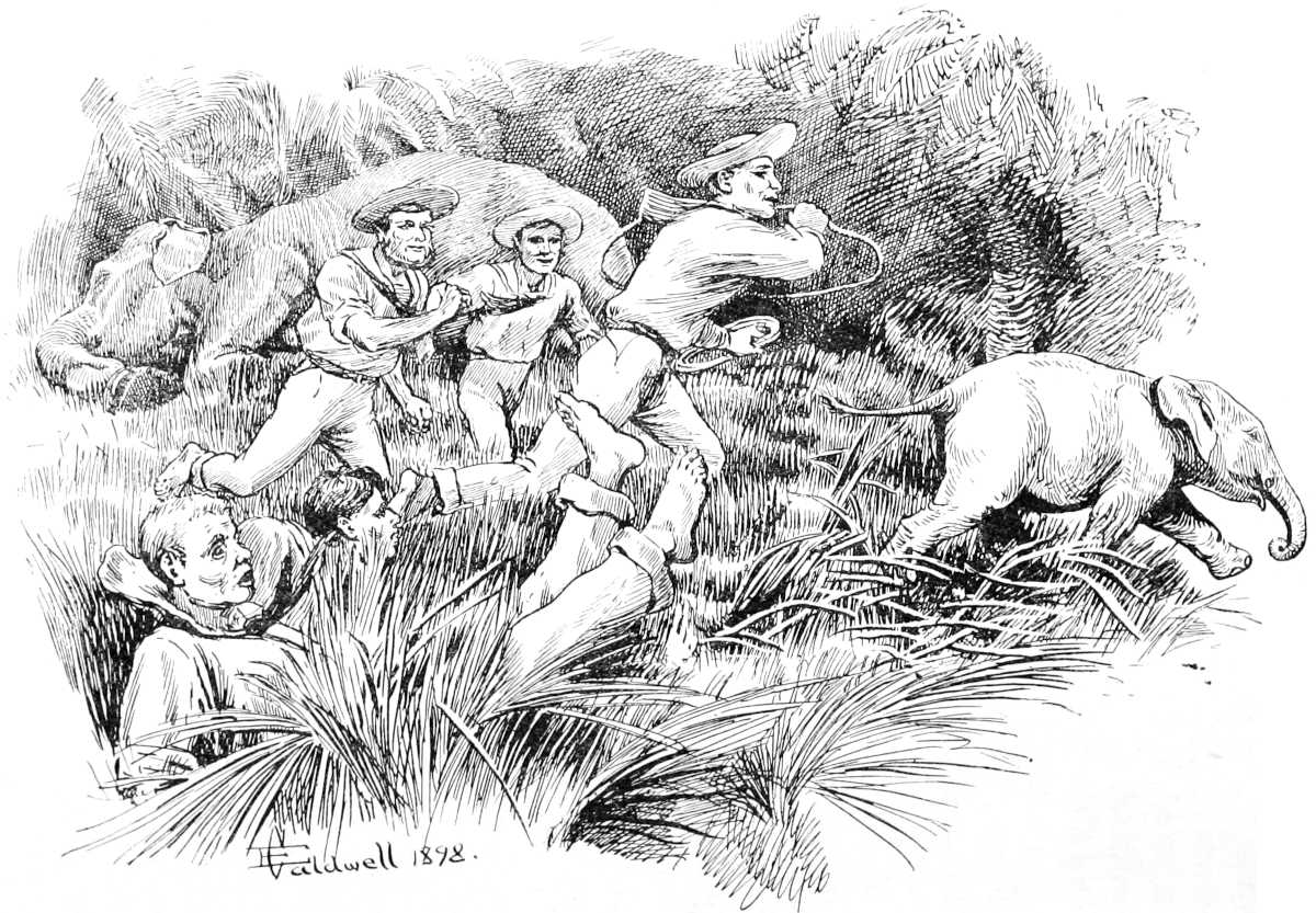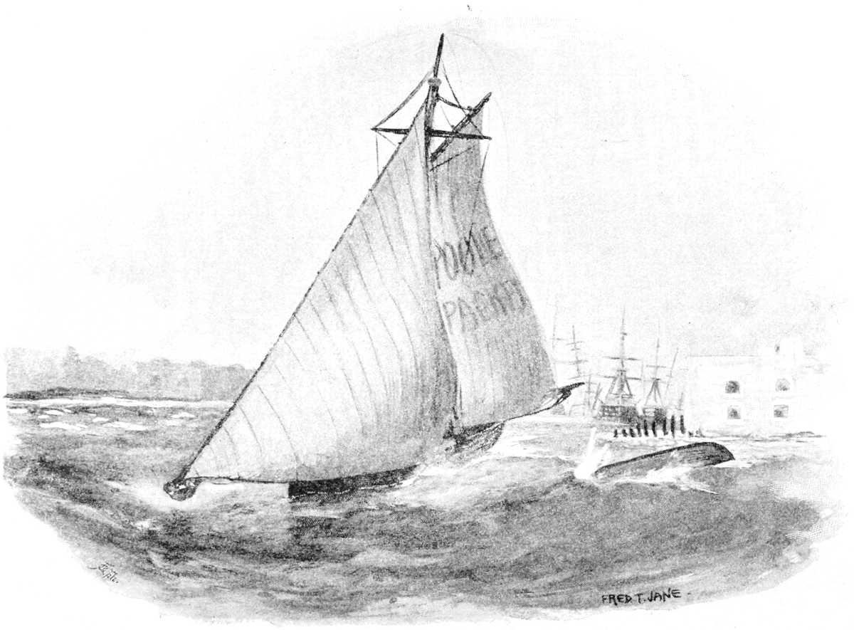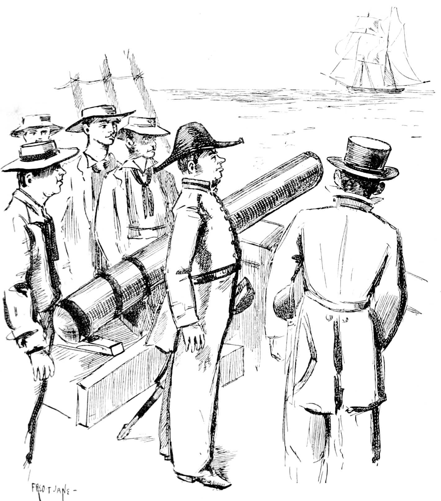I took charge and went on the forecastle, where foothold was difficult. Outside on the starboard bow lay the gun that had been hoisted outside, but as it still clung to the ship, the standing part of the tackle was left in the rigging, with the fall on the forecastle. It was on the edge of this fall that I had got my footing. The tide had risen over the port hammock netting; and just as I was giving the order to cut away, the forecastle gun slipped overboard, taking the tackle with it, on the fall of which I was standing. It caused me to perform an unwilling somersault in the air.