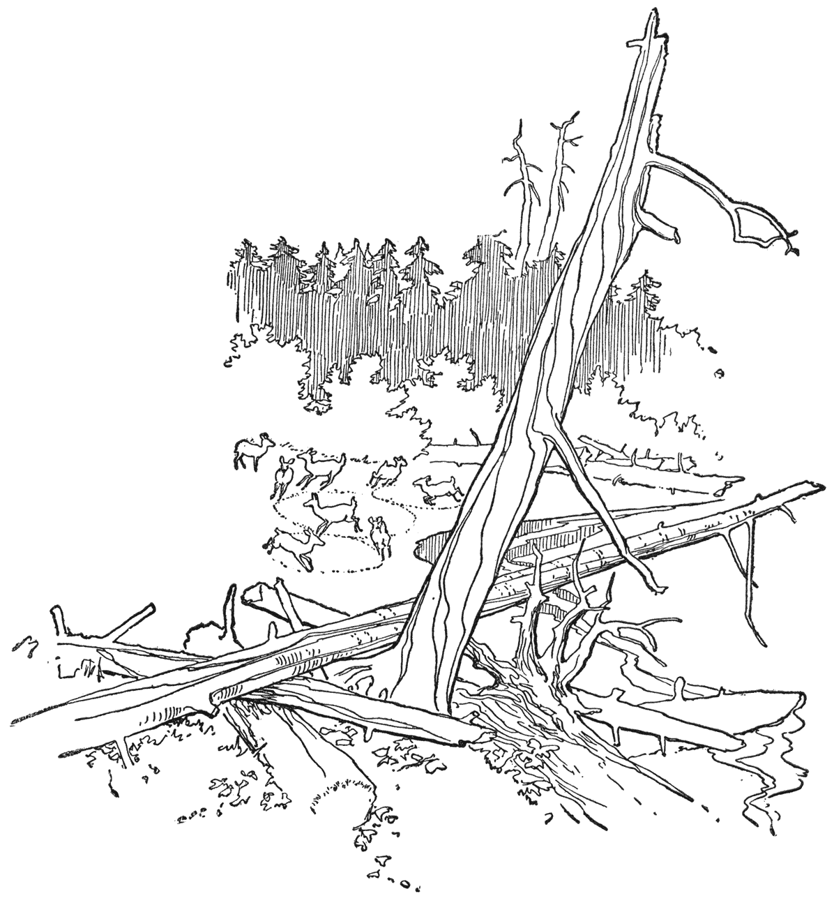 Eens lag ik in de vroege schemering, tusschen wat oude wortels aan ’t eind van dit stukje strand verscholen, een eigenaardig spel gade te slaan. Acht of tien herten: hinden en kalfjes en jonge „spiesbokken,” waren den open oever opgekomen en draafden nu snel in drie kringen, die in één lijn lagen, zoo: ○◯○. In het midden bevond zich een groote cirkel van een vijftien voet middellijn, en aan weerskanten waren twee kleiner cirkels met nog niet half de middellijn van den eersten, zooals ik later merkte door de prenten te meten.