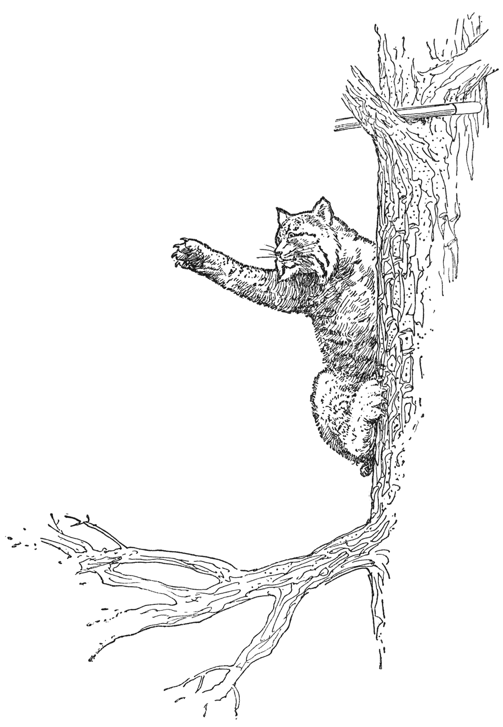 Wanneer het uw eerste wilde kat is, zult ge ternauwernood weten wat te doen—doodstil blijven staan is altijd het beste, tenzij ge een stok of een geweer in de hand hebt—en wanneer ge Pekompf al veel vaker ontmoet hebt, verkeert ge nog precies zoo in ’t onzekere over wat zij dezen keer doen zal. De meeste dieren in de natuur, al zijn ’t ook echte wilde dieren, gaan ’t liefst stilletjes hun gang en zullen diezelfde neiging in u eerbiedigen. Maar wanneer ge plotseling voor een wilde kat staat, zijt ge nooit zeker van haar volgende beweging. Dat is omdat zij een gluiperig, verraderlijk beest is, net als alle katten, en nooit precies weet welke houding zij ’t best tegen u aan kan nemen. Zij wantrouwt u onredelijk, omdat zij weet dat gij háár met reden wantrouwt. Gewoonlijk gluipt zij weg, of springt plotseling de dekking in, al naar uw manier van naderen. Maar ofschoon kleiner dan èn de Canadeesche lynx èn de panter, is ze van nature woester en soms duikt ze neer en grauwt u toe, of zelfs springt ze u naar de borst bij de eerste beweging.