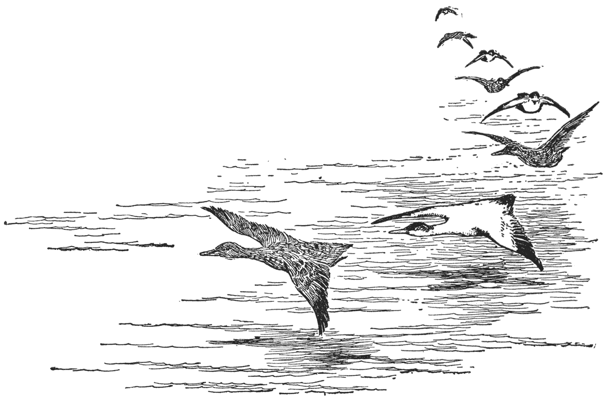 Als ze er maar eerst uit is, heeft ze niets plomps meer over zich. Haar korte wieken rijzen en dalen met een snelheid, die onze oogen tart te volgen. Zoo snel schiet een zwarte eend voor den wind naar lokvogels. Ge kunt haar vluggen, krachtigen slag hoog boven uw hoofd hooren, als ze niet roept. Haar vlucht is heel snel, heel gelijkmatig en dikwijls geweldig hoog. Maar als zij dalen wil, wordt zij altijd bang; dan denkt zij aan haar korte vleugels en hoe hoog ze is en hoe snel ze vliegt. ’s Winters op den oceaan, waar ze ruimte in overvloed heeft, komt zij [110]soms in een lange, mijlenlange schuine lijn naar beneden en plonst als een dolfijn door en over een reeks van golven, eer zij stil kan houden. Maar waar ’t meer klein is en zij op die manier niet kan dalen, beleeft zij duizelige oogenblikken.