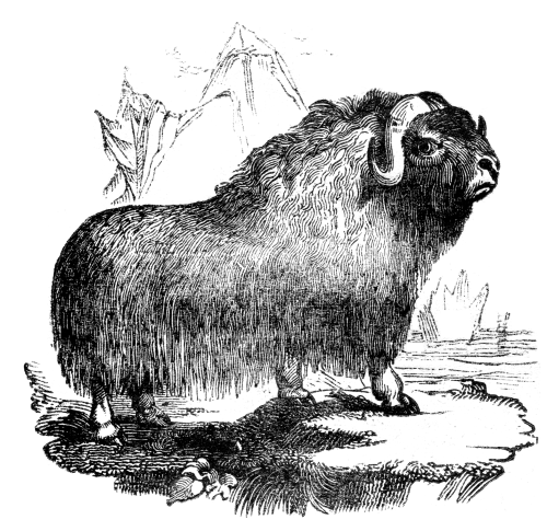 “This species of ox inhabits the North Georgian Islands in the summer months. They arrived in Melville Island in the middle of May, crossing the ice from the southward, and quitted it on their return towards the end of September. The musk-ox may be further stated, on Esquimaux information, to inhabit the country on the west of Davis’ Strait, and on the north of Baffin’s Bay; as a head and horns and a drawing of a bull being shown to the Esquimaux of the west coast of Davis’ Strait who were communicated with on the 7th of September, were immediately recognized, and the animal called by the name of Umingmack. This is evidently the same with the Umimak of the Esquimaux of Wolstenholme Sound, who were visited by the former expedition, and of which nothing more could be learnt at the time from their description than that it was a large horned animal inhabiting the land, and certainly not a rein-deer. It is probable that the individuals which extend their summer migration to the north-east of Baffin’s Bay, retire during the winter to the continent of America, or to its neighbourhood, as the species is unknown in South Greenland.”