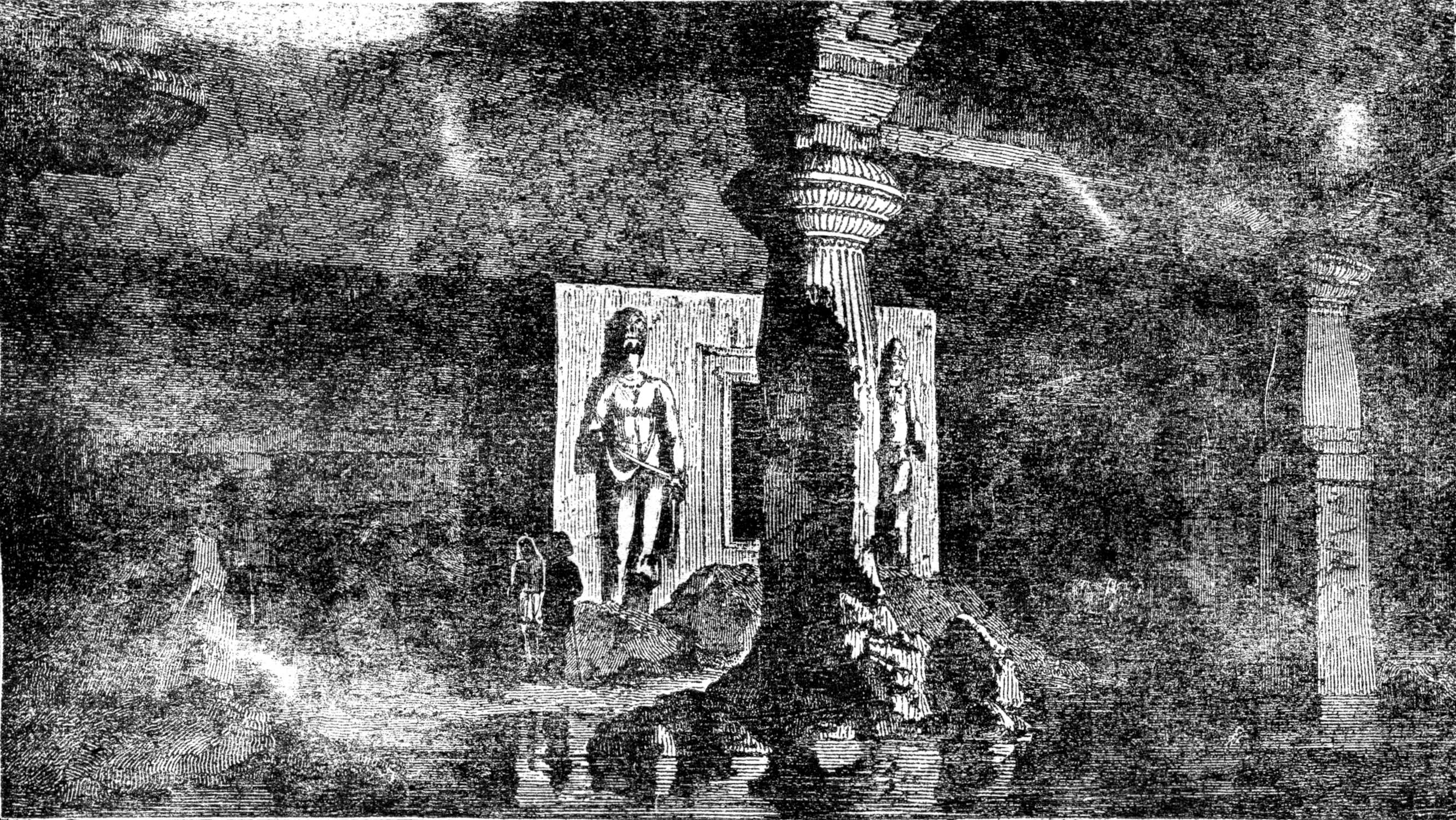 “The entrance into this temple, which is entirely hewn out of a stone resembling porphyry, is by a spacious front supported by two massy pillars and two pilasters forming three openings, under a thick and steep rock overhung by brushwood and wild shrubs. The long ranges of columns that appear closing in perspective on every side; the flat roof of solid rock that seems to be prevented from falling only by the massy pillars, whose capitals are pressed down and flattened as if by the superincumbent weight; the darkness that obscures the interior of the temple, which is dimly lighted only by the entrances; and the gloomy appearance of the gigantic stone figures ranged along the wall, and hewn, like the whole temple, out of the living rock,—joined to the strange uncertainty that hangs over the history of this place,—carry the mind back to distant periods, and impress it with that kind of uncertain and religious awe with which the grander works of ages of darkness are generally contemplated.
