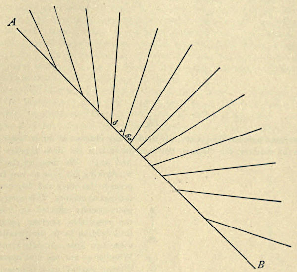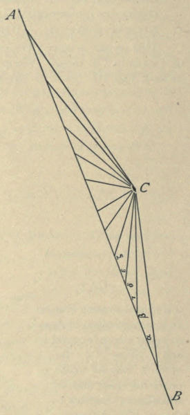 In Fig. 5 we have on the straight line AB a series of stations which are connected with a common centre. The line AB is not a curve, but this figure reminds us of a perspective view of the sector of a circle. The drawing appears as the [653]diagrammatic picture of a shield, the buckle of which is in C. Thus AB is conceived as representing a curve. It does not seem that a comparison of the angles has anything to do with the illusion.
