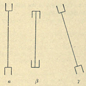 A comparison like that of α and β in Fig. 8, where the equal length of the combining lines is very apparent, induced Brentano to regard the illusion which is observed in Figures 1-3 as due to the angles. In our opinion he is mistaken. For the illusion actually takes place in α and β; only it is quickly corrected with the help of the parallels, which, as in ε, assist the imagination in making an exact comparison. When we place α and β either at a sufficient distance, or are somehow prevented from making use of the parallel lines, we shall have the same illusion as appears in Figures 1, 2, 3. To prove this, we have but to bring the figure α in a slanting position, as is shown in λ, and the illusion is so strong that many will find it difficult to believe that λ is an electrotyped duplicate of α.