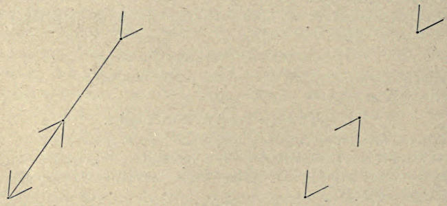 The same must be said about Figure 7. Brentano, in agreement with Lipps, claims that we are inclined to regard the distance between the ends of the two lines as larger than between the points. If there is any illusion at all, it seems to me, that on the contrary, the distance between the ends of the lines appears shorter. And why? We measure the distance by allowing our eyes to run from one point to the other and then comparing the measurements. This comparison is geometrically effected by combining the respective starting points, and thus judging as to the parallelism of these two lines mentally constructed. Whether or not the dots appear equidistant, depends upon the execution of all these operations. While directly measuring the distances between the points, we have an easier measurement where the lines are attached. The lines give to the points a certain vim; they almost appear to move with a velocity indicated by the length of the little lines, while the isolated dots present a very phlegmatic appearance.