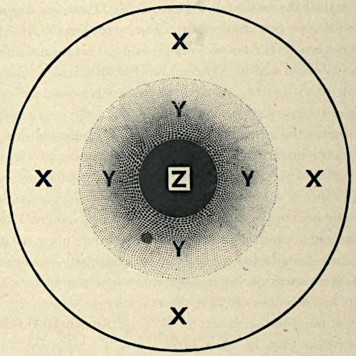 The distance between the points in Figure 17 appears longer than in Figure 16, and in Figure 16 again longer than in Figure 15. The fact is, that before starting on our measurement-journey, we have in Figure 17 already traversed a good distance after having noted the extraordinarily lengthened boundary marks. The town A may be exactly as far as the town B, yet the journey to A will appear longer, if I have to ride an hour before I reach the station, while I may live opposite the terminus of the railroad to B.