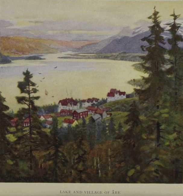 Åre combines the fascination of Swedish winter sports with the thrill peculiar to the Swiss; and while the surrounding country is almost as suitable for cross-country ski-ing as Dalecarlia, it possesses the additional advantage of enabling the winter sport enthusiast to practise almost every variant of ski-ing and winter game. At Storlien, Snasahögarna, and Merakar, there are gradients of every kind, the steepest of these rivalling those of Davos. Åre in certain respects recalls Swiss resorts. Like Davos, it is situated in a mountainous country with high mountain tops in the immediate vicinity. From the lake at the base of Mount Åreskutan (4600 feet) a funicular railway runs up 600 feet, and from this point a bobsleigh run three-quarters of a mile long, with curves as sharp as those of the Cresta, winds down to the hotels below. There are slopes here for every taste: rounded hills, steep slopes, and the famous Tännforsen waterfall, one of the finest in Europe, all within easy distance.