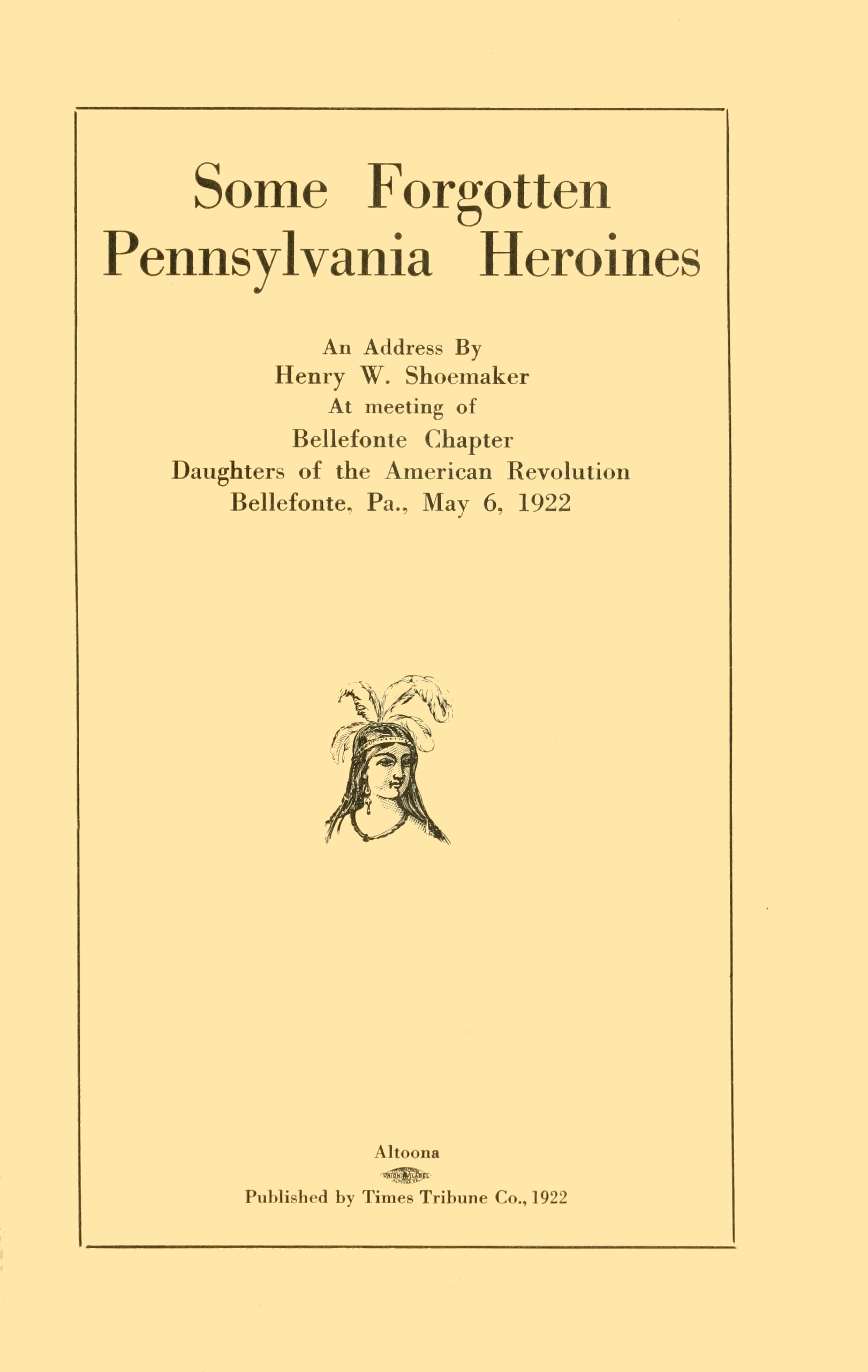 Some months ago, in the daily newspapers, a dispatch dated Washington, D. C., propounded this question: “Who were the greatest women in the past history of Pennsylvania?” Without waiting for the readers of the article to offer suggestions, the following names were mentioned: Betsey Ross, Rebecca Biddle, Lydia Darrah, and Lucretia Mott. It would seem a pity if this quartet should be regarded as the final estimate of greatness in Pennsylvania womanhood, despite the years of persistent propaganda at work in favor of some of them. In the first place the genuineness of Betsey Ross’s connection other than professional with the first American Flag has been frequently questioned, and were it not for her social connections her claims would probably be entirely outlawed; the same is the case with Rebecca Biddle and Lydia Darrah. In this present age we are too prone to estimate a person’s greatness on the basis of wealth and social position. If a wealthy woman delivers a speech, writes a few paragraphs, makes a donation to charity, she is accorded an exalted place in a sycophantic world. A woman’s social position cannot be judged by her occupation; a servant girl may come of an aristocratic family, and a millionaire’s wife, a common vulgarian. It is women like Lucretia Mott, who have triumphed over life’s obstacles, or broken the bonds of caste, and done something uplifting and permanently worth while who will ultimately be classed as the greatest of Pennsylvania women. Lucretia Mott, preacher, teacher and reformer, is too widely known to need further mention here, but there are many other Pennsylvania women, some scarcely mentioned in history’s pages, who should be re-discovered. It may some day be a part of the unselfish labors of the D. A. R. to establish them in their proper places among Pennsylvania heroines. In point of fame which transcends the borders of the State, like in the case of Lucretia Mott, we must not fail to mention Mary Jemison, known as the “White Woman of the Genessee.” In beautiful Letchworth Park, near Rochester, New York, a handsome bronze statue, on a granite pedestal, testifies the high regard in which this remarkable [Pg 4]Pennsylvania woman is held by the people of the Empire State. As a child, in 1755, Mary Jemison was captured by Indians at her parents’ home on Marsh Creek, Franklin County, and taken to Ohio. Later after the fall of Fort Duquesne, she was given the chance to return to her family, but refused, preferring the society of the Indians. She first married a warrior named Sheningey, and after his death became the wife of Hiakatoo, commonly known as Gardeau, a fighting Indian whose name is not remembered in a kindly manner by residents of the West Branch Valley. His part in the tomahawking of the wounded at Fort Freeland, near Milton in 1779, gave him an unenviable reputation, but as to the merits of the case the loyal “White Woman of the Genessee” is silent. As the wife of Hiakatoo, Mary Jemison became the mother of a large family, who inherited a sort of Kingship or overlordship of the Senecas in Western New York State. The last “King” Jemison died several years ago near Red House, on the Allegheny River; in his lifetime he sold patent medicines in Pittsburgh, and exhibited a unique collection of Indian relics, including the silver war crowns of Chiefs Cornplanter, Blacksnake, and Red Jacket. Mary Jemison is principally remembered by her book of memoirs which she dictated to James E. Seaver, an historian, shortly before her death, and which gives a vivid picture of Indian warfare and pioneer conditions during her long life. Her influence on the Indians was beneficent, and her aim was always to bring the two races together in friendly intercourse, her feeling being that, of the two, the Indians were the least savage and warlike. Eastern Pennsylvania can claim another equally picturesque Indian captive in Regina Hartman, yet her unmarked last resting place in Tulpehocken Churchyard, near Stouchsburg, Berks County, is known only to a few, among them Dr. Walker L. Stephen, of Reading, the best-posted Indian folk-lorist in Pennsylvania. If Regina Hartman had lived in New England or Europe she would rank as one of the great historical personages of all time, yet Pennsylvania claims only a mild acquaintance with her. For the benefit of those present who have not heard of her strange story, we will summarize it briefly. During an Indian attack along the Blue Mountains, in the vicinity of the present Town of Orwigsburg, Regina, then nine years of age, was carried into captivity by the Indians, and for seven years was taken from place to place by her captors. At last, [Pg 5]after the final peace of the French and Indian War, in 1763, when Mary Jemison elected to remain with the Indians, a great army of white prisoners were turned over to the British Colonial forces, and sent east to Carlisle Barracks, to be restored to their relatives. Regina Hartman’s mother journeyed to Carlisle, but out of the long line of sunburned children who were marched past her could not recognize her long lost daughter. The unhappy woman, in bitter disappointment after her long trip, broke down and wept. Her grief attracted the attention of Colonel Henry Bouquet, the brave deliverer of Fort Duquesne, a Huguenot from Switzerland, who was in charge of the released captives, and addressing her in Pennsylvania German, he asked if there was any song that she used to sing to her missing daughter in the old childhood days. The poor woman recollected one particular hymn, and going along the lines of refugees started to sing:
