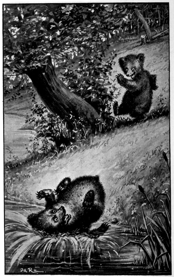 One lazy afternoon Twinkly was just nodding off to sleep, all curled up in a little fuzzy ball, when Woof came up from behind and gave him a shove. Now, as it happened, Twinkly had been lying at the top of a steep incline that led down to Lone Lake, and he went down that incline like a rubber ball, before ever Mother Black Bear could stop him. Bump—slide—splash!—and he plunged beneath the surface of the icy lake.