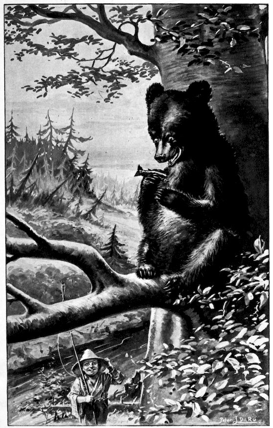 By dint of much shoving he finally got his head clear inside the cask. Then he was happy. My, how that bear enjoyed the 175next half-hour! By stretching his neck farther and farther through the narrow opening he could just scrape the delicious contents with his teeth.