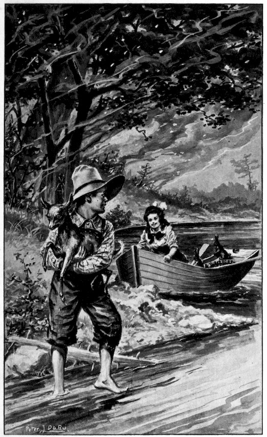 The Boy dropped his oar again and stepped ashore, while his sister held the boat, with its cargo of brown bunnies, in position, by 161reaching out and clinging to an overhanging bush.