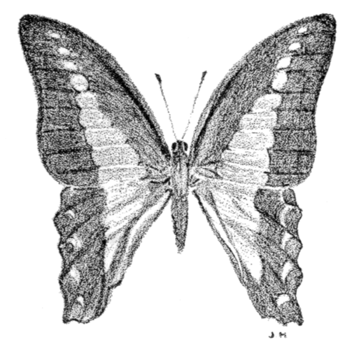 Most interesting of all to the non-entomological mind are the butterflies. Down in that tangle of trees, grass and ferns are to be found the larvæ and pupæ of many butterflies which in time develop into living jewels. On dull days, and in late afternoons, the funny little caterpillars of the small blue butterflies march out in a solemn [Pg 7]procession to feed on the thick fleshy leaves of the mistletoe which grows so lavishly throughout the wilderness. Later they wander down from the mistletoe clumps and enter the nests of the stodgy brown sugar-ants to pupate. It is strange to think that these gay, blue creatures rise from among such queer bed-fellows to flutter round my garden flowers. For in time all the full-fledged butterflies leave the denseness of the wilderness to hover over my beds of zinnias and larkspurs, outshining the brightest blossoms. Most gorgeous, I think, are the vivid turquoise blue and black ones called Papilio, which attract me by their name as much as by their beauty. Very lovely, also, are the big brown butterflies with the eyes on their wings, while there is a distinct fascination about the little “skippers” which vary in shade from cream to brown, and which are known by their different flight.