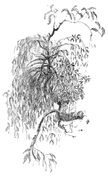 Close by the creek grows one of the loveliest of the wild trees, the native cherry (Exocarpus cupressiformis). There is quite an old-world charm in its formal cypress shape, which seems to reprove the irregular gums and she-oaks; and the gold-green of its tender tips stands out in lovely contrast against the blue-green and silver-grey of the other trees. When the setting sun catches it through the taller tree trunks it glows like a fairy Christmas tree, and one can picture the little folk dancing round it in a ring. It grows at the very edge of the once cultivated plot, and I think the planner of that garden must [Pg 9]have stopped short just there in order to save the lovely thing. Beyond all this is natural bush, with tall spotted pink orchids pushing through in the spring-time, under the golden pultenea and dillwynia, and in summer a white cloud of snowbush.