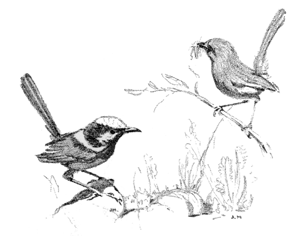 One more of our visitors I must mention, and that is the native canary, which comes each year, builds his little domed nest in a sapling, and fills the air with his sweet song. Then there are the everyday birds, the dear, familiar things which are with us all the year round. Every gardener knows them—blue wrens and tits, jacky winters and yellow robins, redheads and spinebills, peewees and kookaburras—they are the usual inhabitants of our suburban gardens, and dear to us all because of their friendly, fearless ways. Other birds come and go, but they stay with us all the time, building and breeding in the wilderness each spring. In the two years that I have known this wild patch I have counted seventy-two species of birds passing through. Some, as I have said, are there all the time; some come at certain seasons, [Pg 19]sing for a space amongst the tree-tops, feed for a week or so on the berries and blossoms, then pass on to other feeding grounds, while others stay just for an hour, glad of a safe and sheltered resting-place on their long, mysterious journeys to and fro across the land.