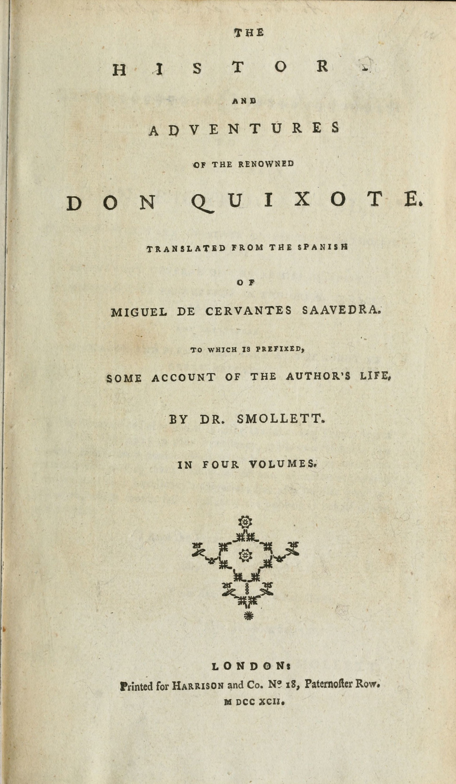 The permission I obtained to inscribe the following Translation of Don Quixote to your Excellency, while you resided in this Capital, affords me a double pleasure; as it not only gives me an opportunity of expressing that profound respect and veneration with which I contemplate your Excellency’s character; but also implies your approbation, which cannot fail to influence the publick in behalf of the performance.
