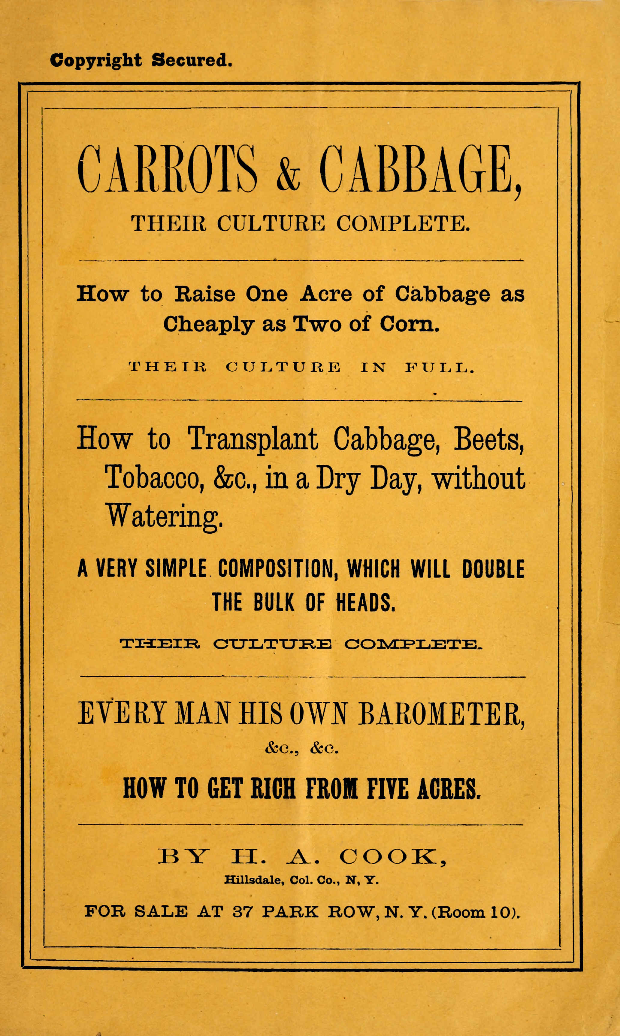 After having reduced my experiments to a system, and found that I could raise them with less than half the expense of the old way, I conceived the idea of putting 4my plan of raising in the form of a pamphlet, and disclosing it to the world. While raising carrots I also experimented on cabbages, and found them also to be a remunerative crop. The success which I reached in raising them I attribute to a composition which I apply to the roots, so that they may be transplanted in a dry day instead of a wet one, thereby leaving the ground mellow; my entirely new mode of culture, and, lastly, my valuable composition (which is simple, cheap, and in the reach of all) for the heads, which augments the crop by half at least. Here, reader, I will leave you to peruse the following pages.