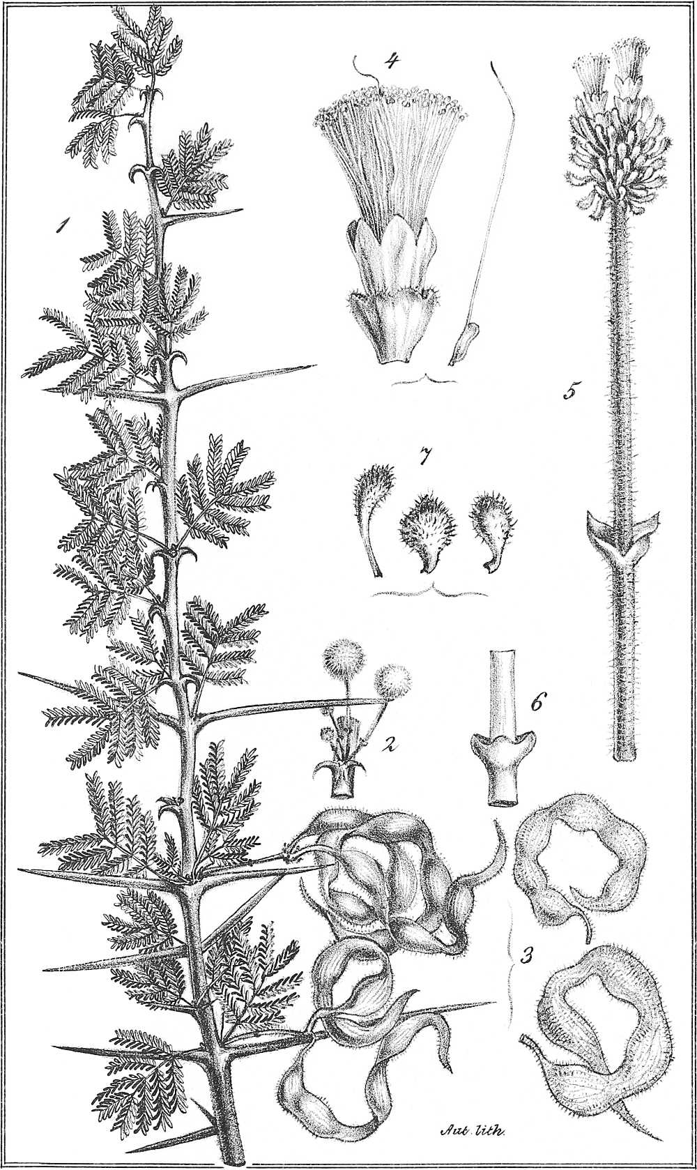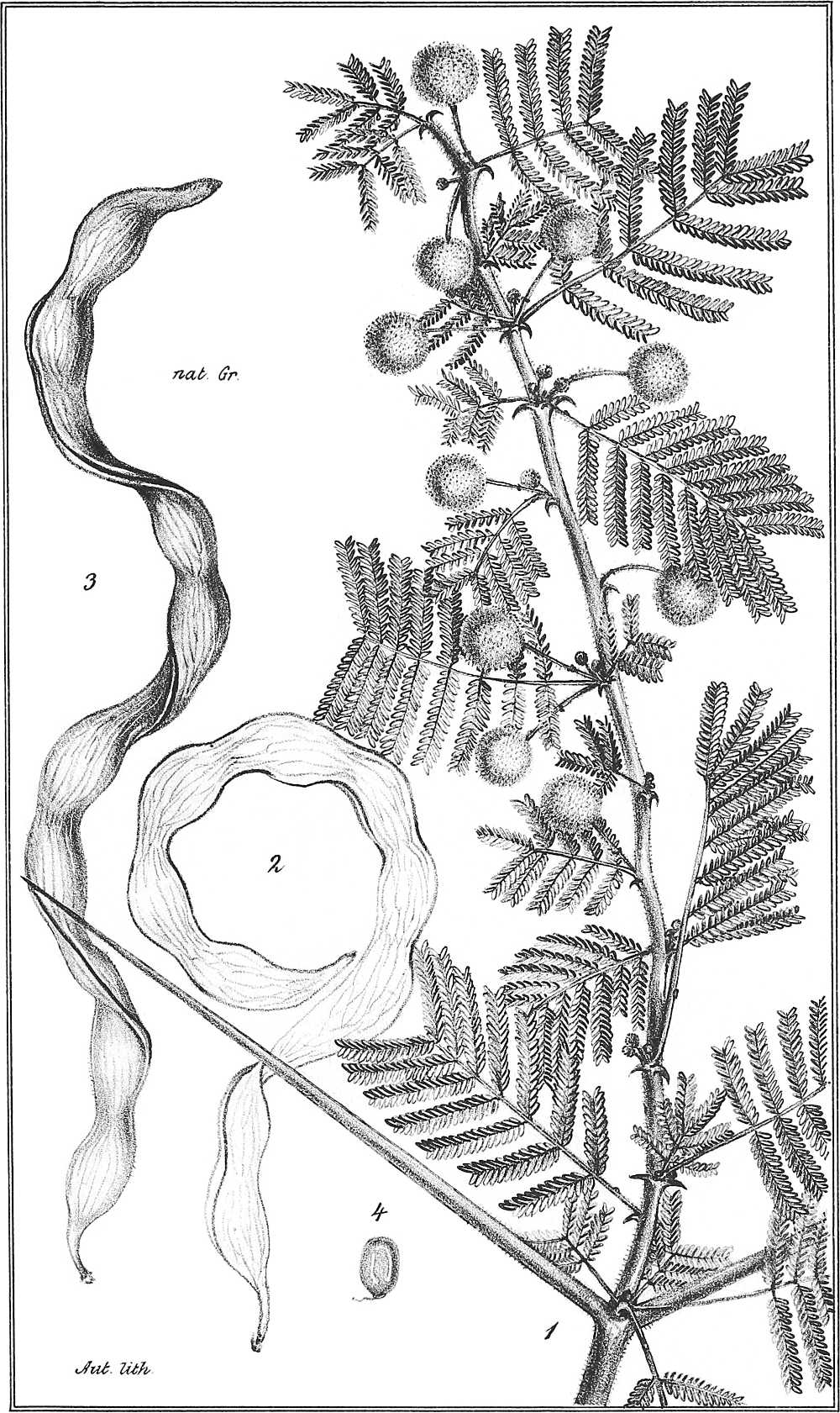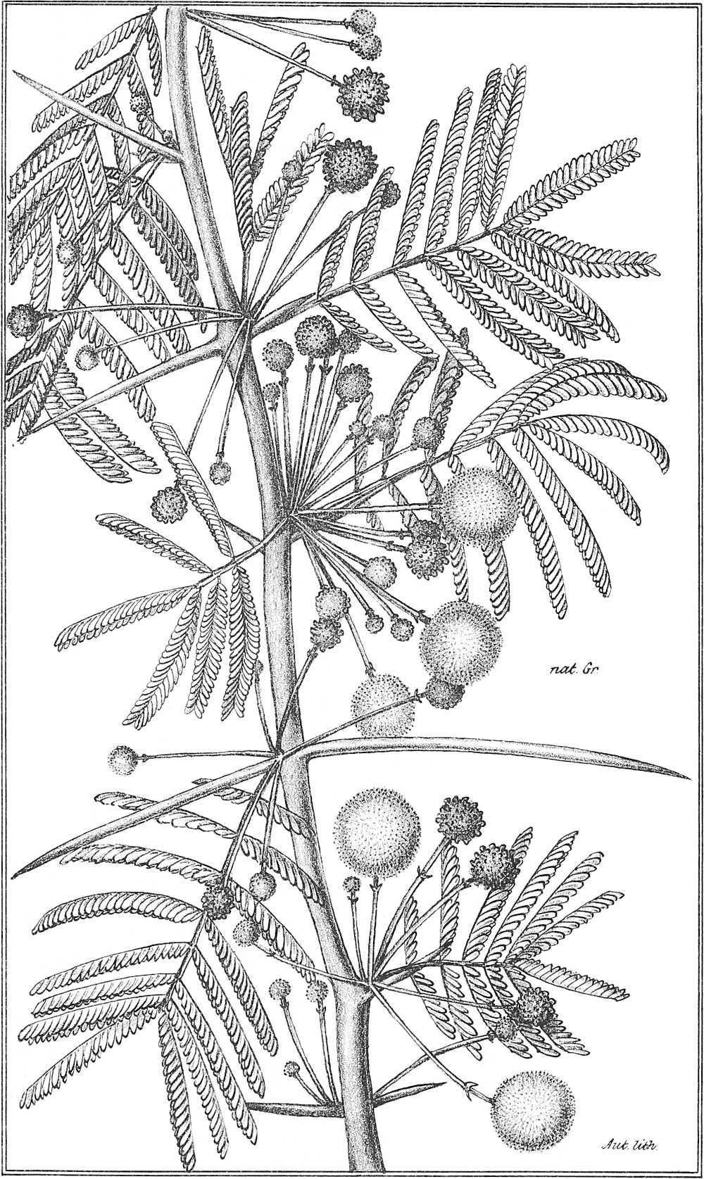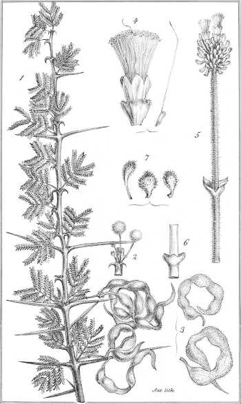 Ramulis pubescentibus, stipulis parum spinescentibus interdum coriaceis brevibus e basi lata subulatis erectis; foliis[361] maximis 8-12-15-pollicaribus pinnis 20-30-jugis, foliolis 30-40-jugis linearibus cultriformibus acutiusculis mucronulatis longitudine latitudinem 4-5-superantibus siccis rufescentibus petiolo communi tomentello basi 1-glanduloso; inflorescentia coaetanea panniculam laxam terminalem efoliatum efformante, pedunculis 3-5-fasciculatis, ½-1-pollicaribus medio vel infra medium bracteolatis, capitulis (aurantiacis?) siccis badio-ferrugineis; leguminibus coriaceis fuscis nitidis obsolete irregulariterque venosis, planis oblongo-linearibus 5-6-uncialibus, 8-11-spermis, seminibus compressis subrotundis acutiusculis, latere linea circulari impressa notatis.