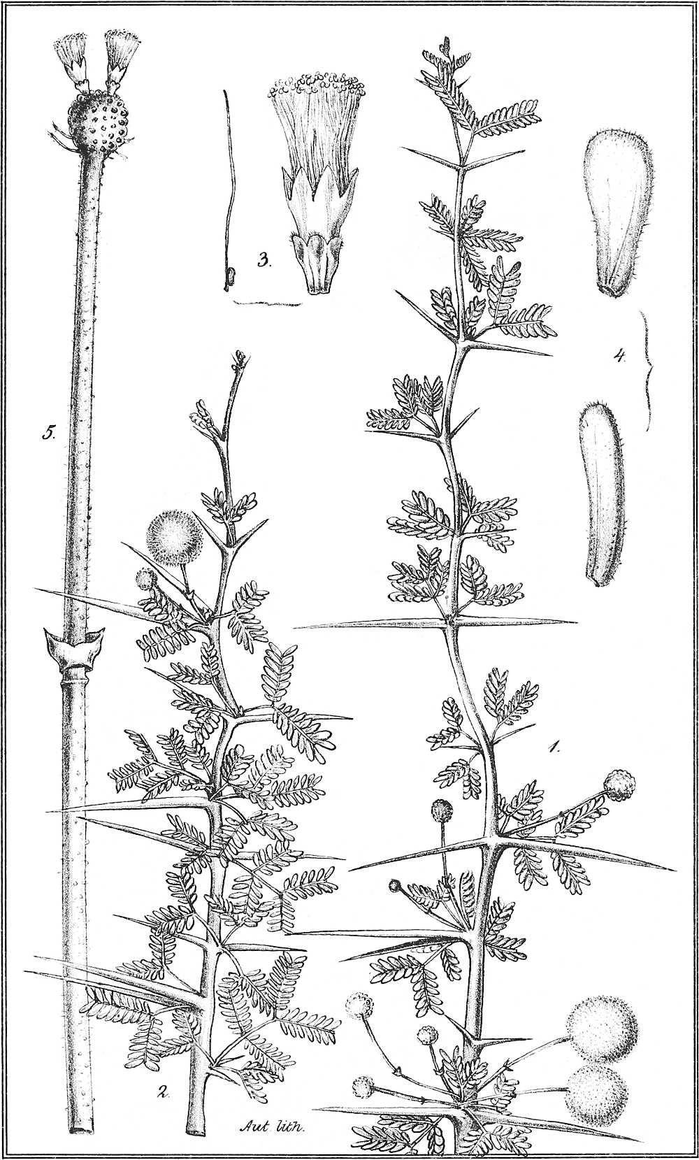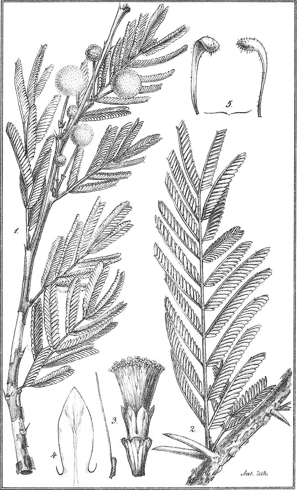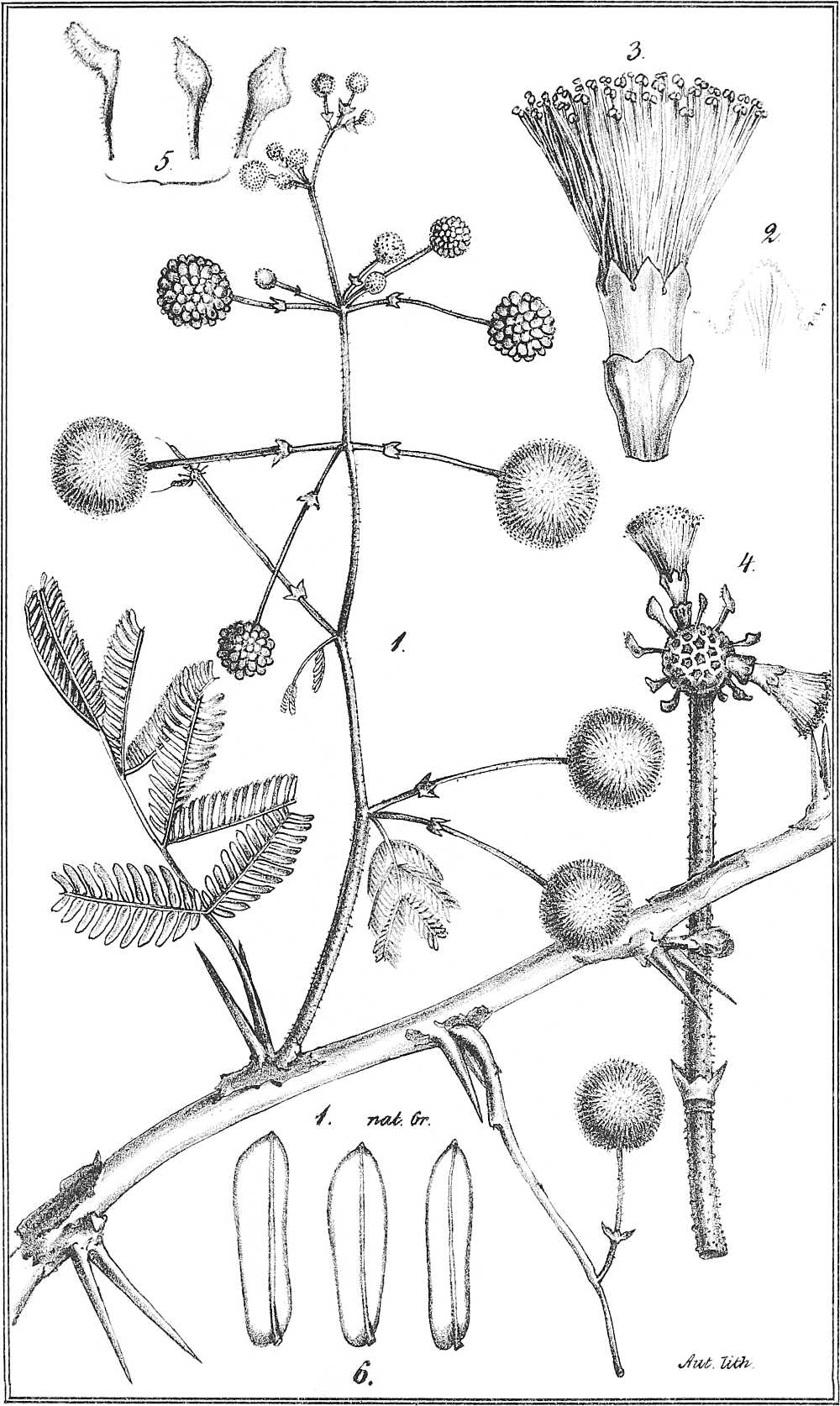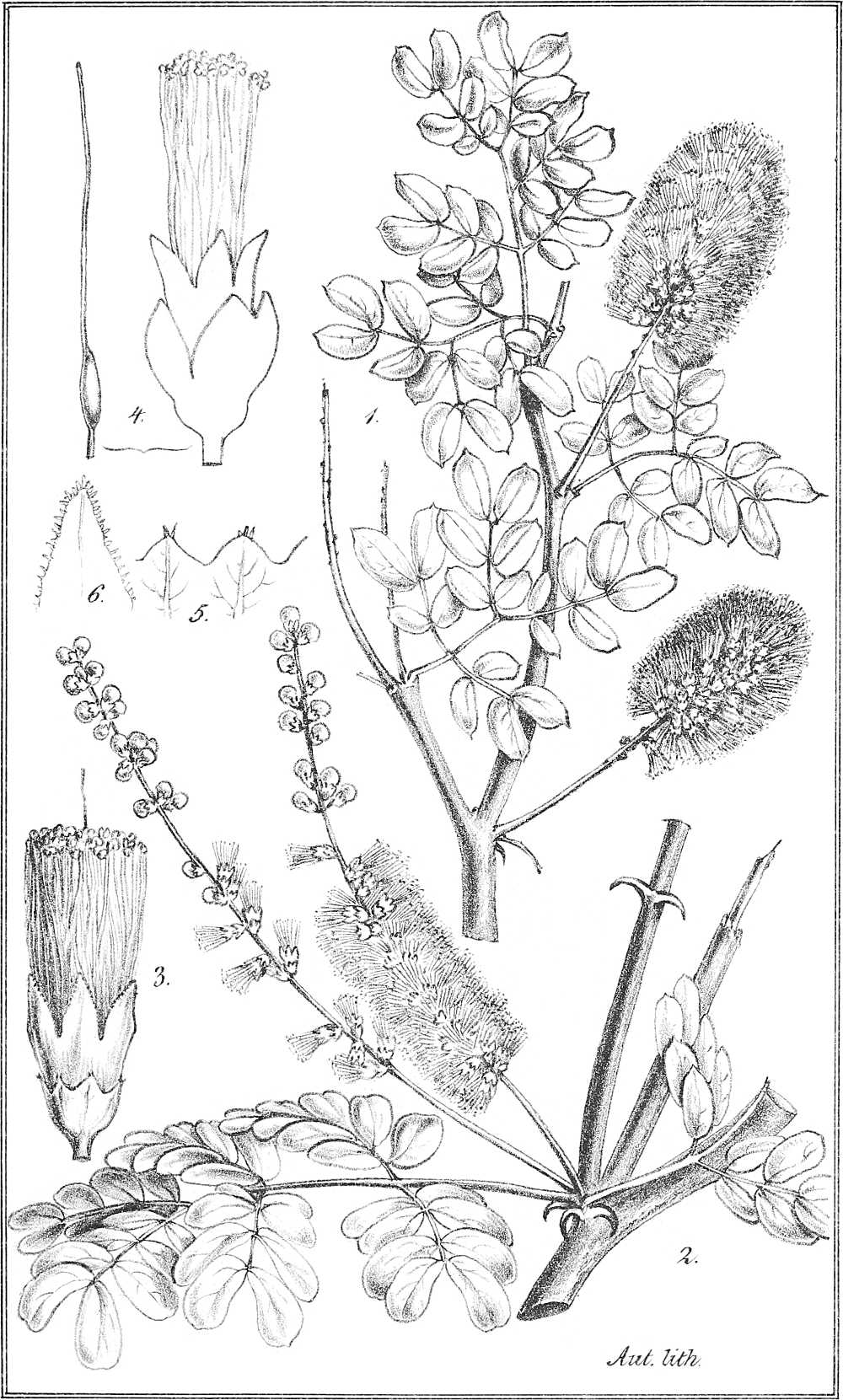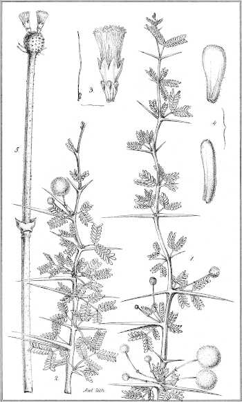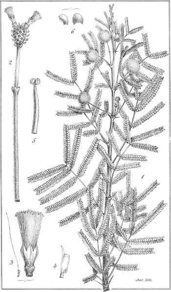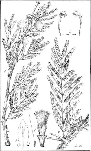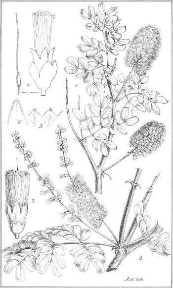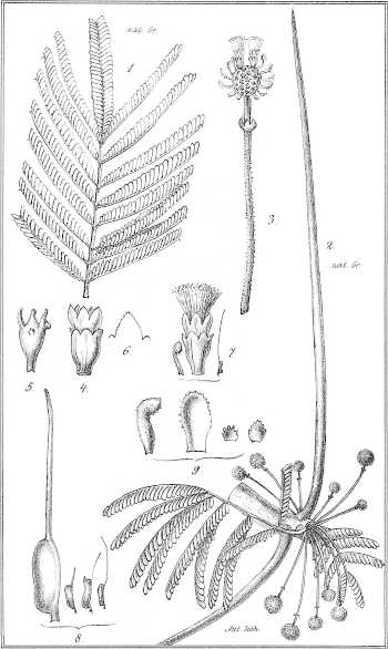 Taf. XV. 1. Ein blühender Zweig mit zwei einjochigen Blättern. 2. Desgl. mit 2-jochigen Blättern. (nat. Gr.) 3. Blüthe und Fruchtknoten. 4. Staubgefäss. 5. Blüthenköpfchen nebst Stiel.
