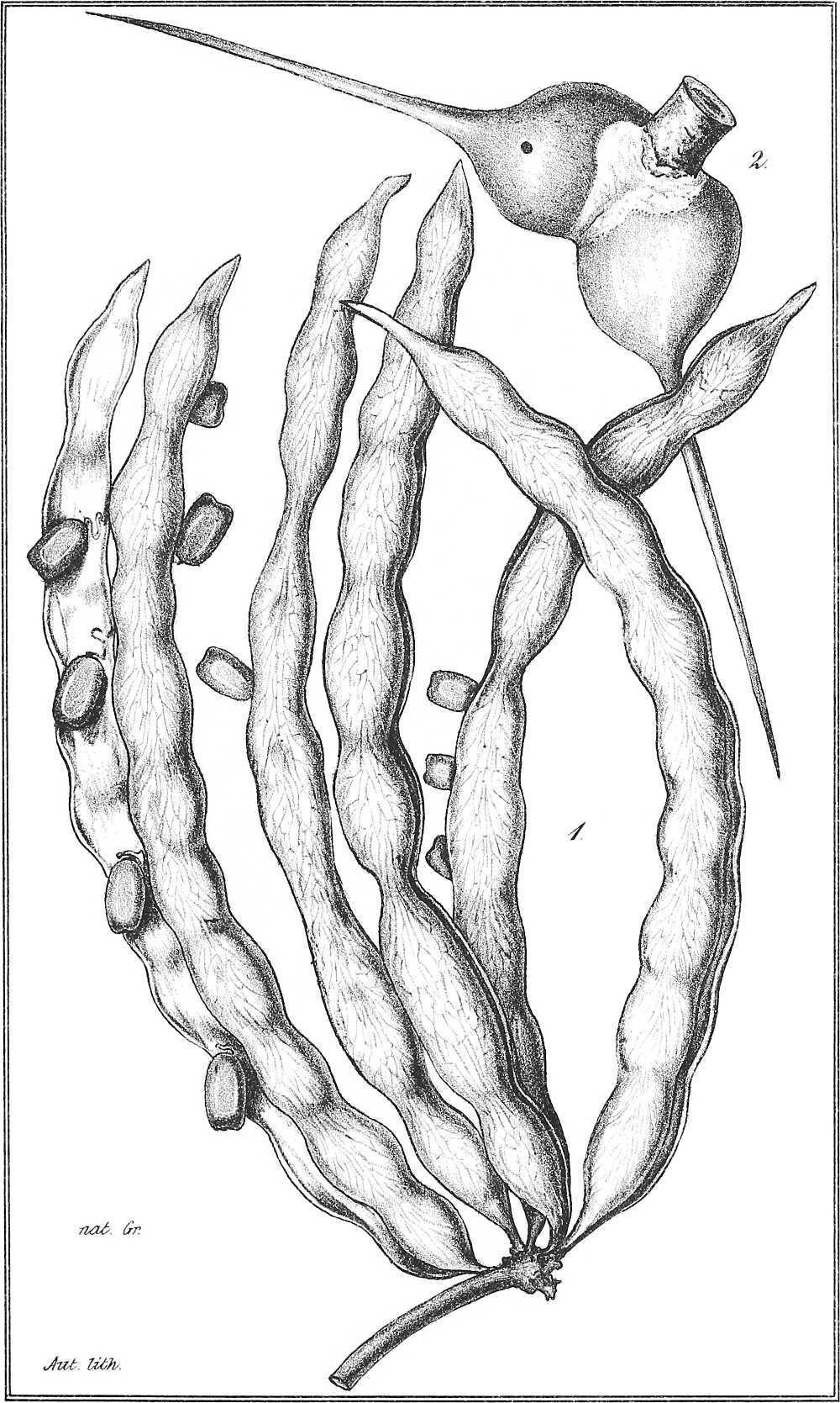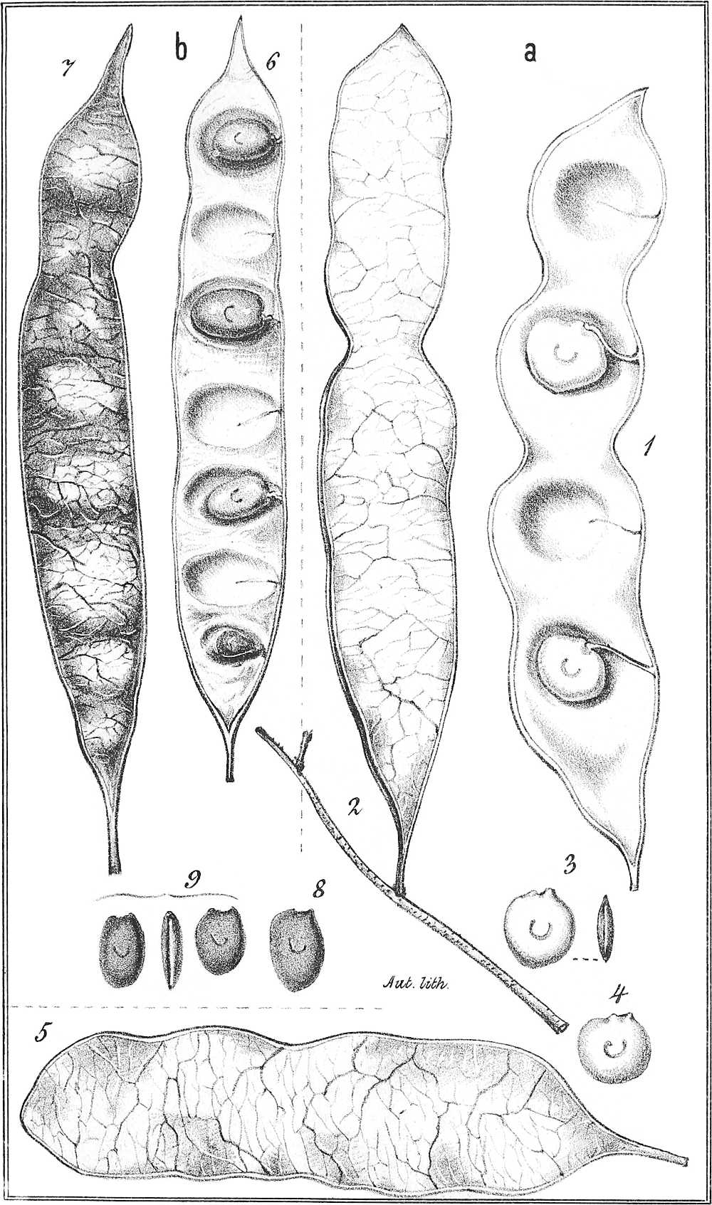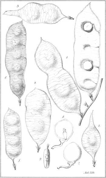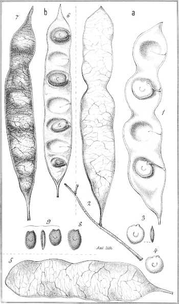 Taf. XXI. 1. Zwei Hülsen mit 3 und mit 4 Samen. 2. Hülse mit 1 Samen. 3. Dito mit 2 Samen und langer Spitze. 4. Dito mit 2 Samen und stumpfem Ende. 5. Dito mit 4 Samen, von geringerer Grösse und ohne Einschnürungen. 6. Dito mit 5 Samen, von ausnahmsweise länglicher Gestalt. (Alle nat. Gr.) 7. Same. 8. Längsdurchschnitt durch einen Samen. 9. Same von der Rückenseite gesehen.