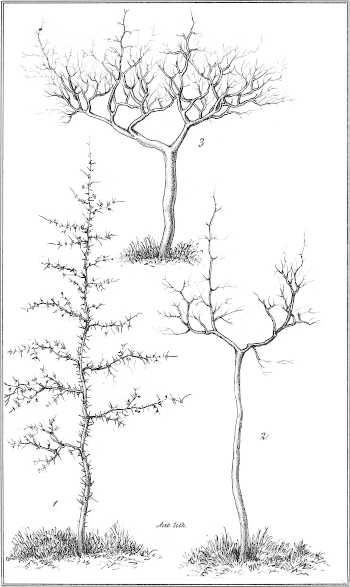 Die Stipular-Dornen fehlen an manchen Zweigen gänzlich oder verkümmern an den Spitzen zu kleinen Borsten; an anderen bilden sie gerade, elfenbeinweisse oder hellbräunliche, glänzende, wagerecht abstehende, 1½ Ctm. lange,[357] starke, am Ende plötzlich zugespitzte Waffen; oft nehmen sie eine kegelförmige Gestalt an.