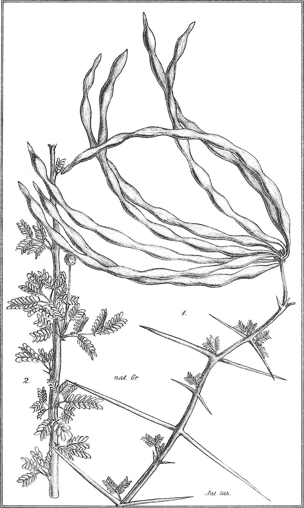 Arbor media trunco erecto cortice griseo-rimoso in ramis pallidiore in novellis albido striato tomentoso; aculeis ternatis, infrastipularibus atris nitidis ad apicem ramorum lucidis plus minus nunc deorsum nunc sursum curvatis, infrafoliaceo aequali recurvo; foliis cinereo-viridibus uncialibus junioribus tomentoso-villosiusculis 3-5-jugis, foliolis 10-15-jugis parvulis linearibus longitudine latitudinem 4-5-superantibus acutiusculis, petiolo communi basi apiceque glandula parva ornato; inflorescentia coaetanea folia paullo antecedente spicis 3-pollicaribus folia multo superantibus albidis in axillis singulis interdum 3-aggregatis; leguminibus 3-4-pollicaribus linearibus membranaceo-coriaceis pallidis[375] basi attenuatis apice acutiusculis planis tenuissimis transverse venosis marginibus parallelis vel saepius undulatis interdum valde constrictis 5-6-spermis; seminibus subrotundis valde compressis aeque longis ac latis interdum latioribus quam longis linea arcuata concava medio notatis.