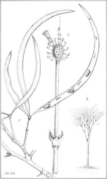Taf. XVIII. 1. Ein fruchttragender Zweig. 2. Ein Blüthenköpfchen mit Stiel und Bracteenkragen. 3. Baumschema.
