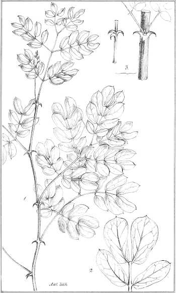 Taf. XX. 1. Blattzweig. (Nat. Gr.) 2. Blättchen (vergr.). 3. Zweigtheile mit gedreiten Stacheln. (Nat. Gr.)