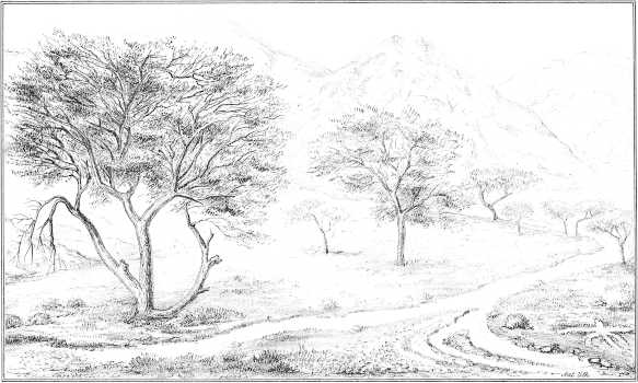 Da waren es denn auch vorzugsweise die Acacien, welche als treue Begleiter auf allen seinen Wegen dem Reisenden bald sympathisch wurden, so wenig auch anfänglich ihr Aeusseres Einladendes zu besitzen schien. Indess es erging ihm hier wie mit den rohen Bewohnern jener Gegenden, welche, entsprechend dem allgemeinen Charakter ihrer heimathlichen Natur, bald abstossend durch Misstrauen und Fanatismus sich des Fremdlings erwehrten, wie die Dornen der Acacien, oder wie letztere da, wo sie gebogen und gekrümmt erscheinen, sich mit bettelhafter Zudringlichkeit an seine Fersen hefteten. Auch hier gab es noch Mittel, um sich, über die rauhe Aussenseite hinwegsetzend, mit den Vorzügen ihres besseren Ichs vertraut zu machen. Ein fortgesetzter Umgang mit ihren Dornen und Stacheln gab dem Reisenden solche an die Hand, Kratzwunden an Armen und Beinen lehrten denselben seine Gewandtheit verdoppeln, um sich ihren unsanften Umarmungen zu entwinden, zerrissenen Kleidern verdankten solche von starrem Leder ihre Entstehung, und zu den allen Attaquen hohnsprechenden Dornenkronen bahnte ihm schliesslich ein Taschenmesser den Weg, behutsam Dorn für Dorn mit demselben entfernend; kurz und gut, wie die Klaue der Katze nichts Gefährliches mehr an sich hat, wenn man sie nur richtig zu nehmen weiss, so wurden mit der Zeit auch die Acacien des Reisenden trauteste Freunde, spendeten ihm mit Hülfe eines über ihr blattloses Gestell gespannten Tuchs selbst Schatten inmitten der ödesten Wüste, oder vertheidigten an anderen Orten die Eingänge seines Lagers gegen die Zudringlichkeiten nächtlicher Räuber.
