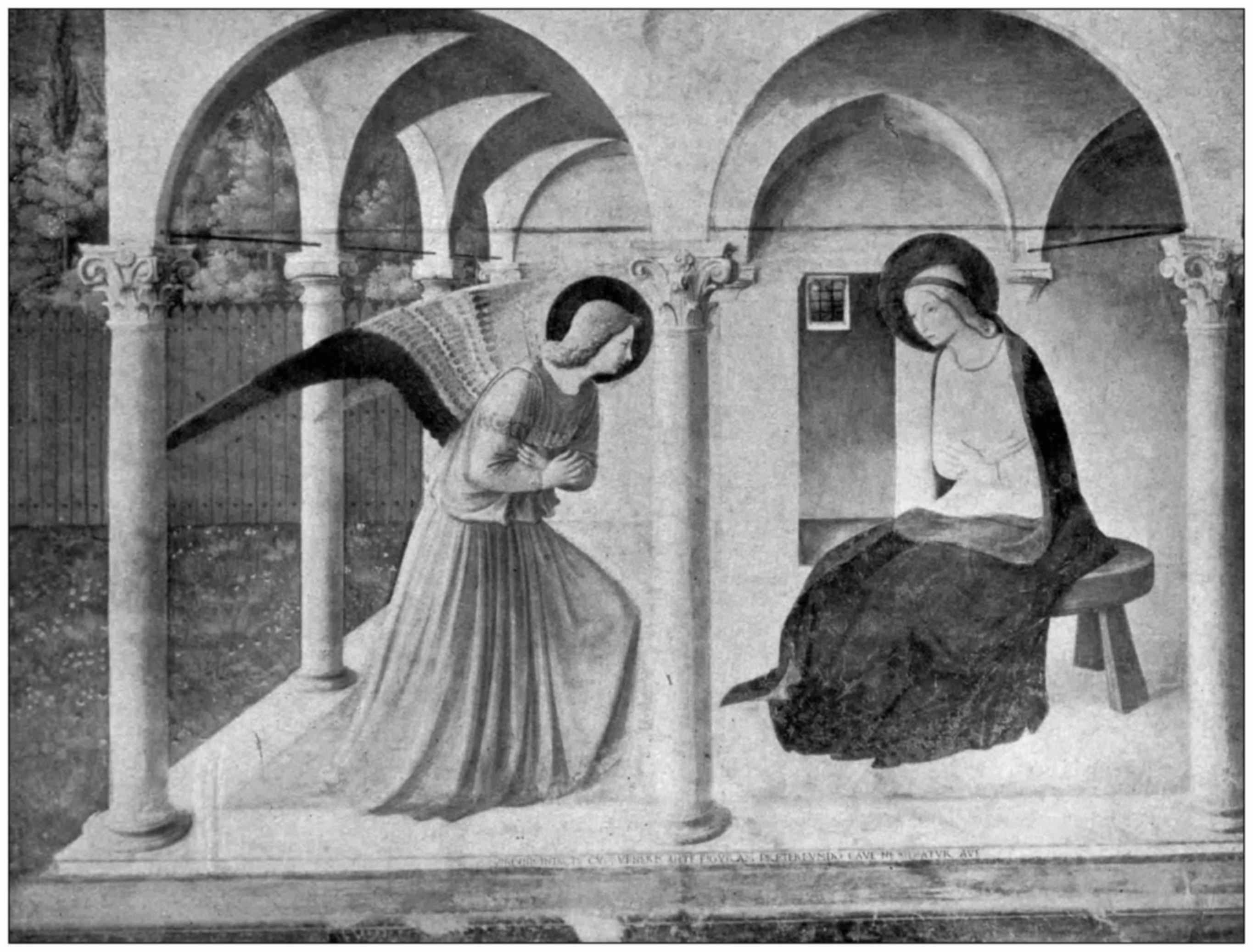 His pictures affect one as do things seen in a dream, and we accept his visions without questioning details which, if they were not somehow wrapped in his sentiment, would make us smile at their childishness. The little arcade under which the Virgin sits, in the picture of the Annunciation (one of the most beautiful of his works), is so low that she could hardly stand upright in it; but it does not matter, nor do the little toy trees and towns and towers that we find in his pictures. They are symbols only, and we do not question their details; nor are we conscious, in Angelico’s work, of the model as an individual.
