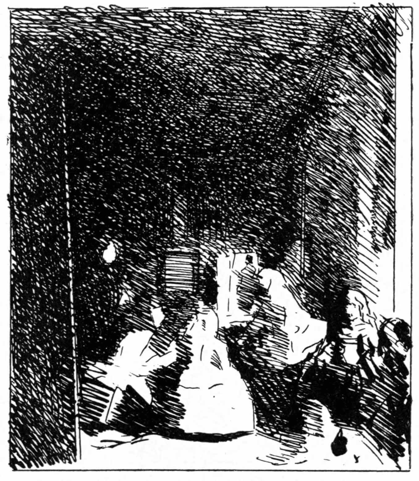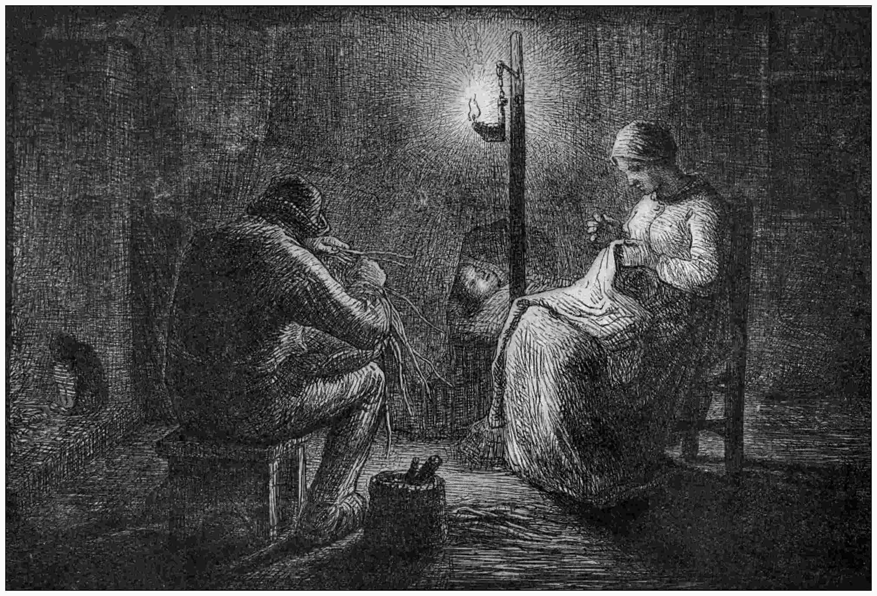 There is never, in the work of Millet, any consciousness of the spectator. His people are always intent on their occupation, not posing to the painter, not regarding anything outside their work. In the drawing of “Night,” how well the intentness of the figures is expressed! And nothing is forced; it is all quite natural.