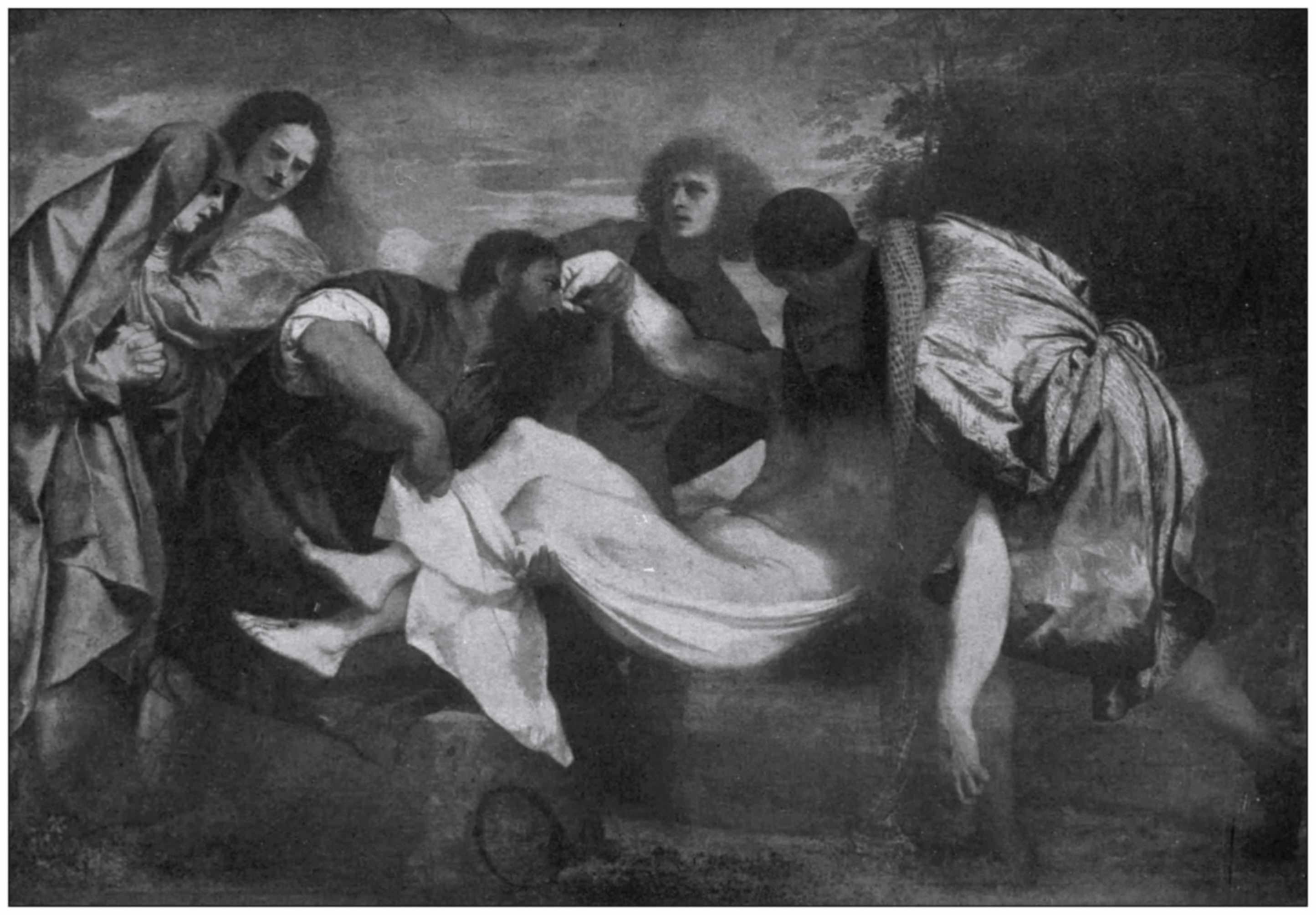 His method was usually to keep the principal parts of his picture warm and light, and this warmth was enhanced by the blue of the sky, which he frequently used in his background; and the colours of his principal figures were made to tell out strongly, as well as separated from the background, by masses or spaces of shadow in the middle distance; as we see in the picture of the “Entombment” in the Louvre. We may notice, too, in this picture how the central light is packed round with various colours—rich reds and dark greens—in the dresses of the supporting figures.