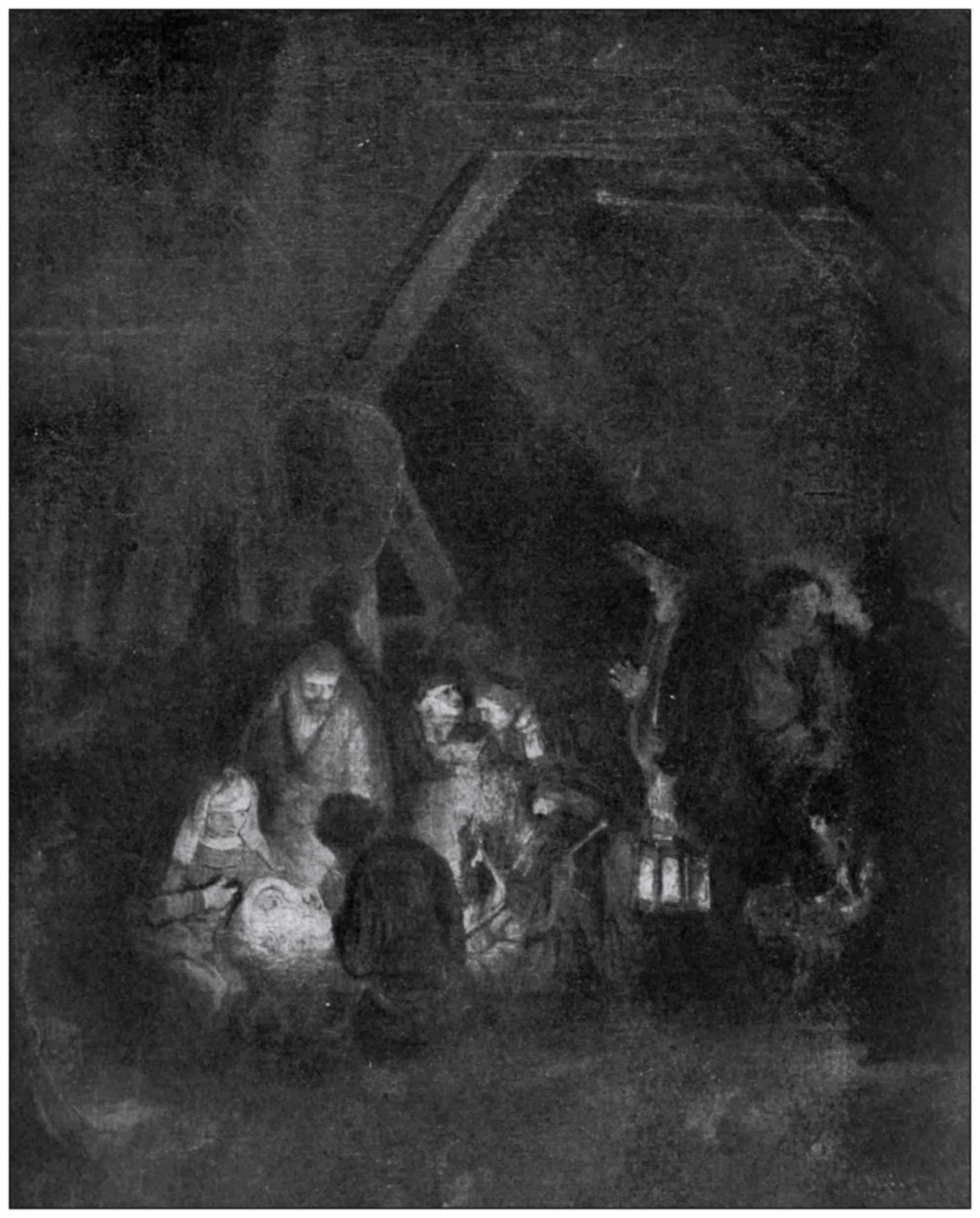 Rembrandt’s eye seems to have been always attracted to the point of light, or the source of light, when the actual colours of objects were rather suggested than seen, or if the light shone on objects it was always focussed on the principal parts by shadows; and we find his work characterised by the most searching study of shadows and their infinite gradations, as well as of the diffusion of light. This study of light[83] and shade in his pictures is so thorough as to seem an end and object in itself, but it was only with him the means of expressing or enhancing his idea. The idea and its presentation are inseparable, and his pictures seem to be imagined rather than constructed. He seems to take a suggestion from some very ordinary scene, and to carry it on in his mind and make it significant; as in the “Adoration of the Shepherds” in the National Gallery, the light and shade motive of which was probably inspired by something he happened to see in a stable.