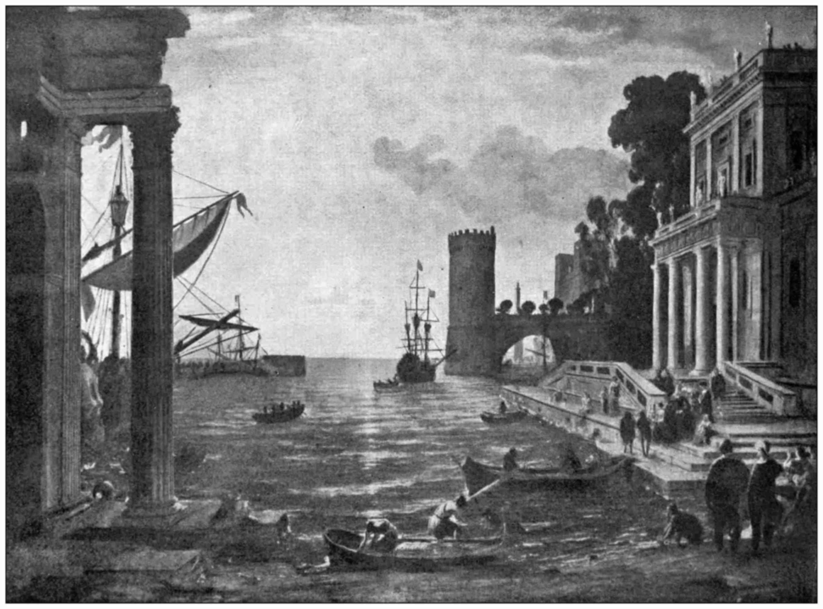 All the great landscape painters have presented Nature in the way I have indicated, as records of her moods. Claude, in his picture of the “Queen of Sheba,” did not, we may be sure, care about the Queen of Sheba at all. She was only a point for his picture; nor was he much interested in the towers, columns, and palaces which frame his picture. What he wanted to paint, what he wanted to impress upon us, was the beauty of the evening sun shining in the clear sky over the sea; and so well did he do it that the sun still shines in his picture, after over two hundred years. No one but Turner has ever equalled him in the knowledge of subtle gradations of light. An infinite space in air is suggested without forcing the range of colour; for the lightest part of the picture is far from white, and the darkest part by no means black.