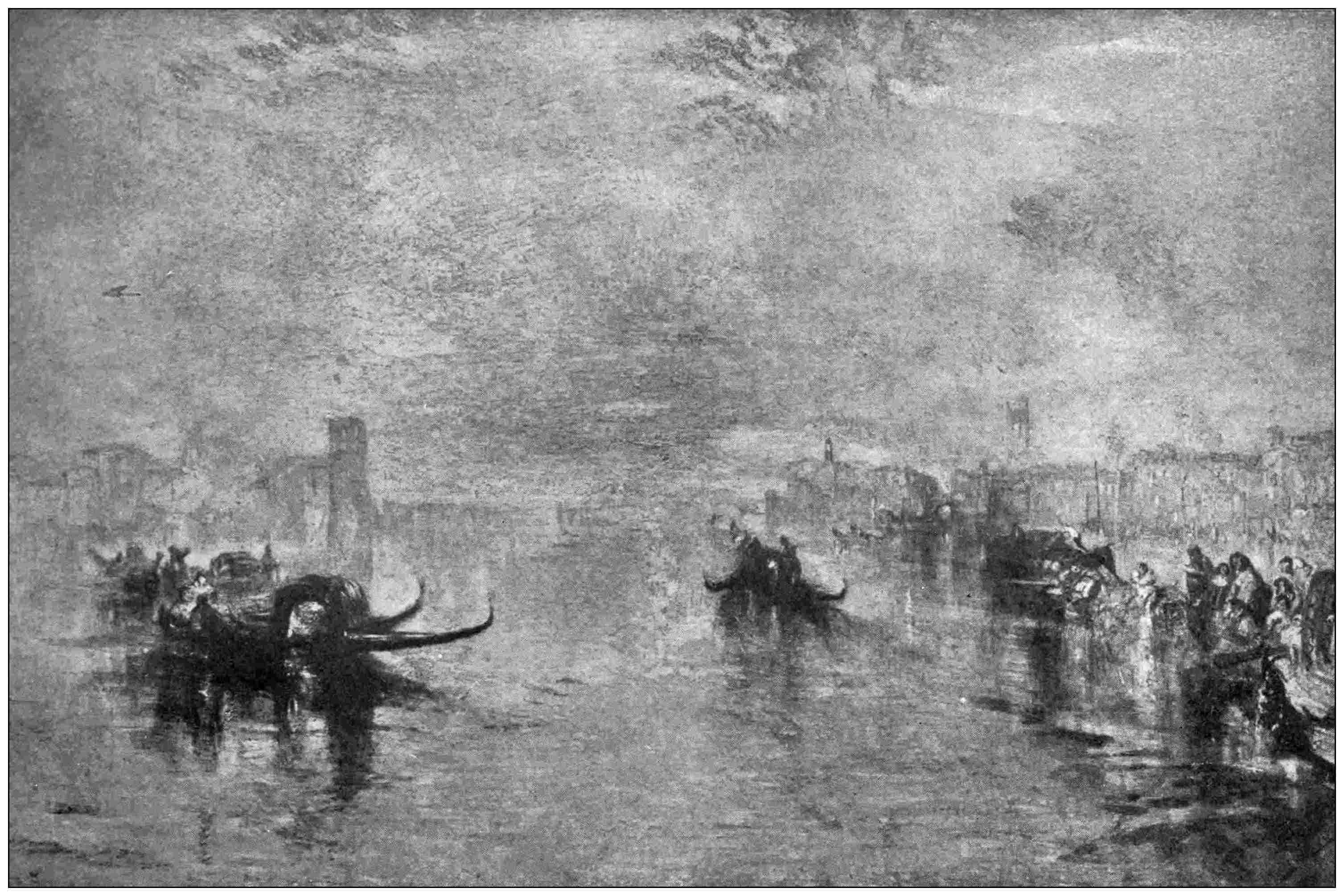 Wilson and Turner followed in the same path. Wilson’s work is most beautiful in its direct, full painting, but he is limited in his range; while Turner’s seems to know no limit, for he touched the extremes of light and dark, of sunshine and of gloom. Such pictures as the “Shipwreck,” the “Sun rising in a Mist,” and the “Calais Pier” show the power which he possessed—in which he is quite unapproachable—of giving the greatest minuteness of detail without losing the breadth of the general impression. In his later work, as in the “Approach to Venice,” detail was suggested rather than expressed, but it was fully suggested. How delicate, in these pictures of his later time, are the gradations, and how slight the intervals between the tints!
