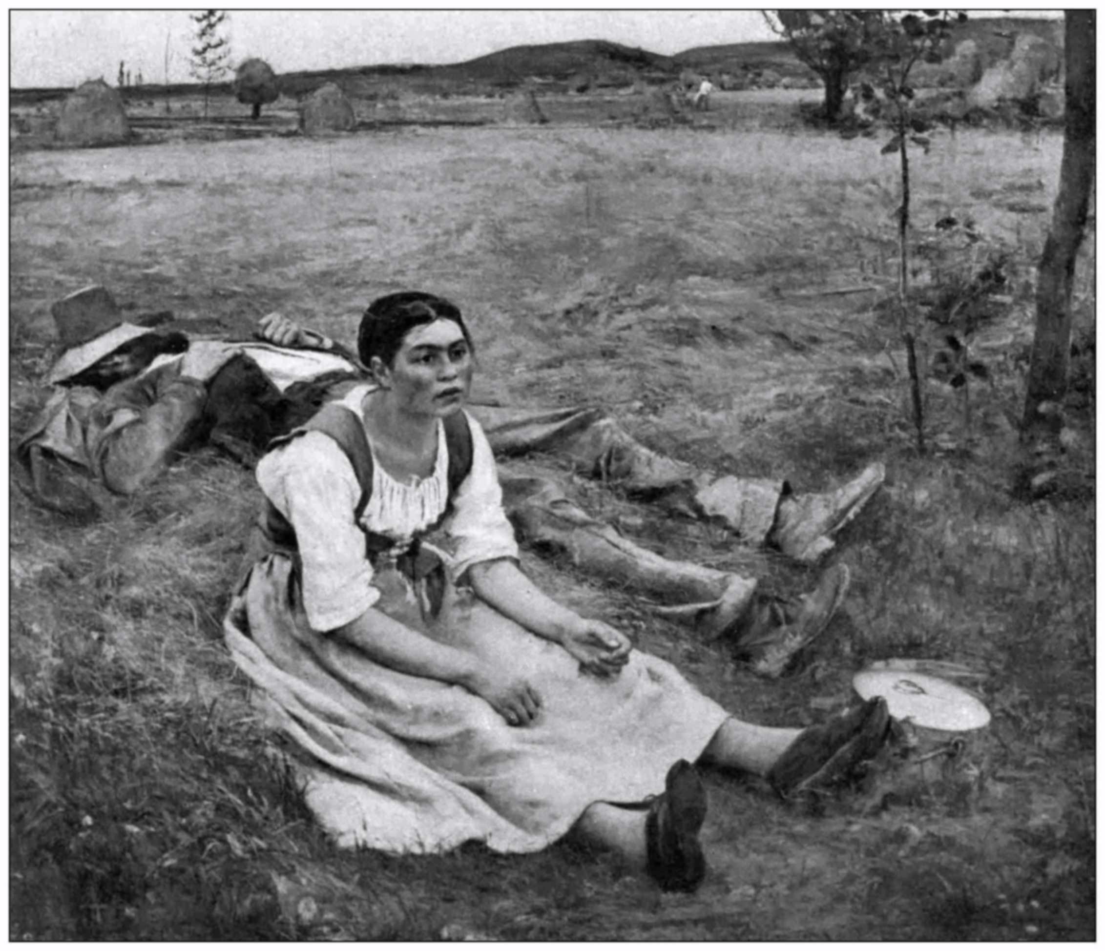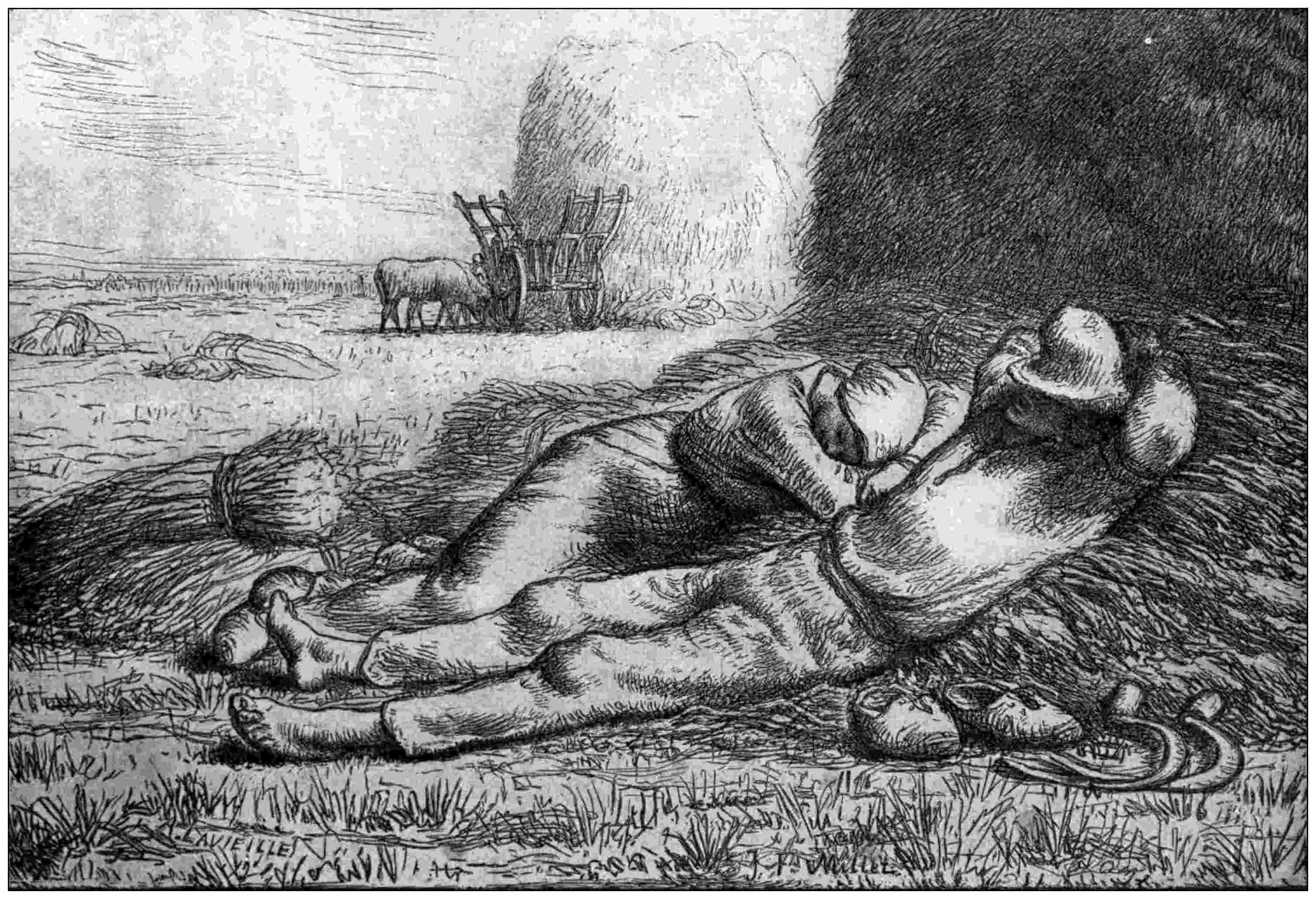 There is a design of Millet’s, one of a series he drew on the wood for engraving—a mid-day rest—which we may compare with the “Foins” by Bastien Lepage. No doubt Bastien was inspired by Millet, and I think we must agree that the impression of the subject is stronger in Millet; of the individual in Bastien Lepage.