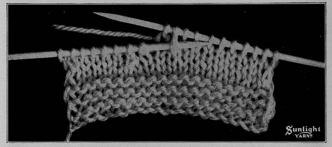 3rd row: Slip 1, having the thread to the left side of the stitch, * knit 4, purl 2 and repeat from * to end of row.